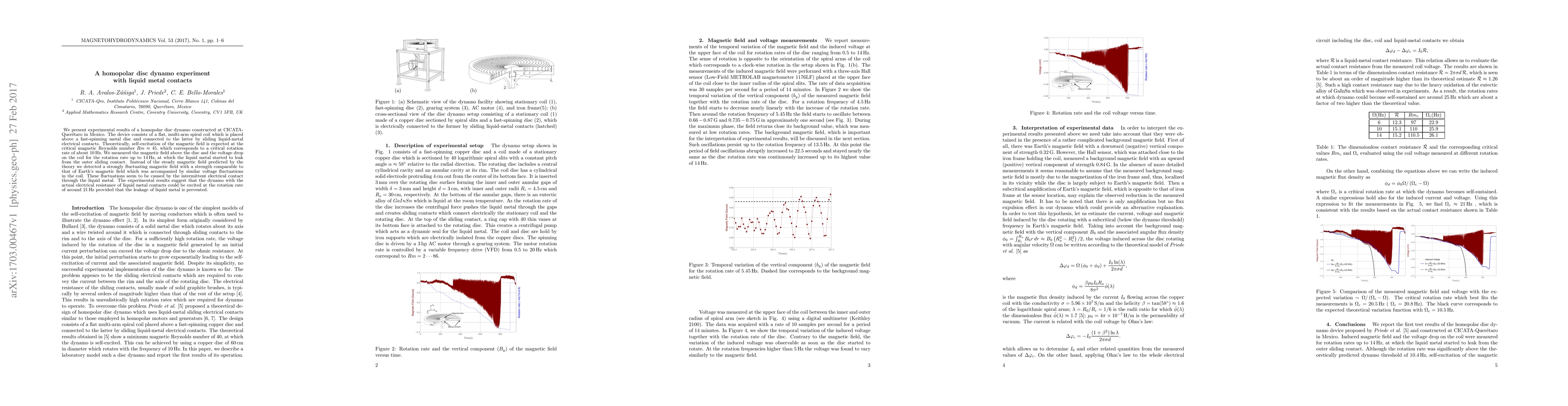 This paper reports experimental results from a homopolar disc dynamo with liquid-metal contacts, revealing fluctuating magnetic fields and voltage drops instead of the expected steady state, likely due to intermittent contact. The dynamo could theoretically self-excite at a rotation rate of around 21 Hz if liquid metal leakage is prevented.