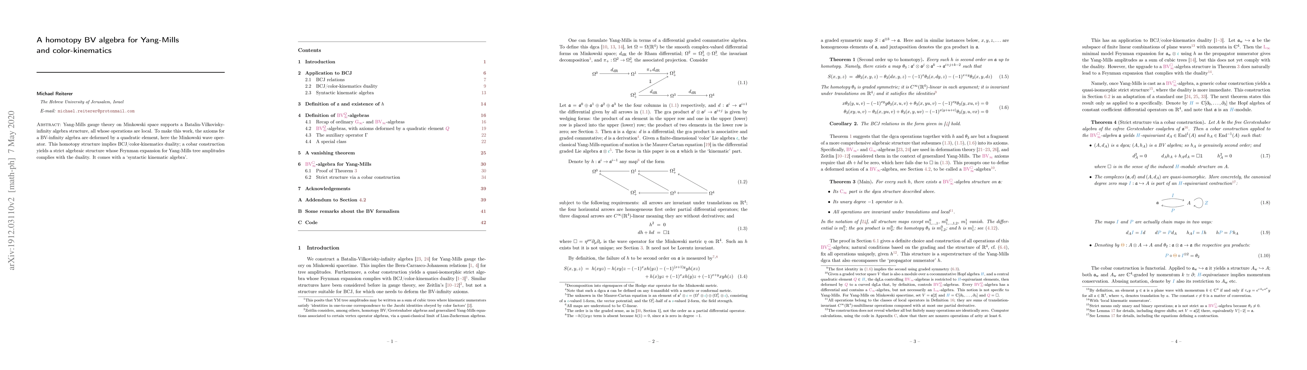 Yang-Mills gauge theory on Minkowski space supports a Batalin-Vilkovisky-infinity algebra structure, all whose operations are local. To make this work, the axioms for a BV-infinity algebra are deformed by a quadratic element, here the Minkowski wave operator. This homotopy structure implies BCJ/color-kinematics duality; a cobar construction yields a strict algebraic structure whose Feynman expansion for Yang-Mills tree amplitudes complies with the duality. It comes with a `syntactic kinematic algebra'.
