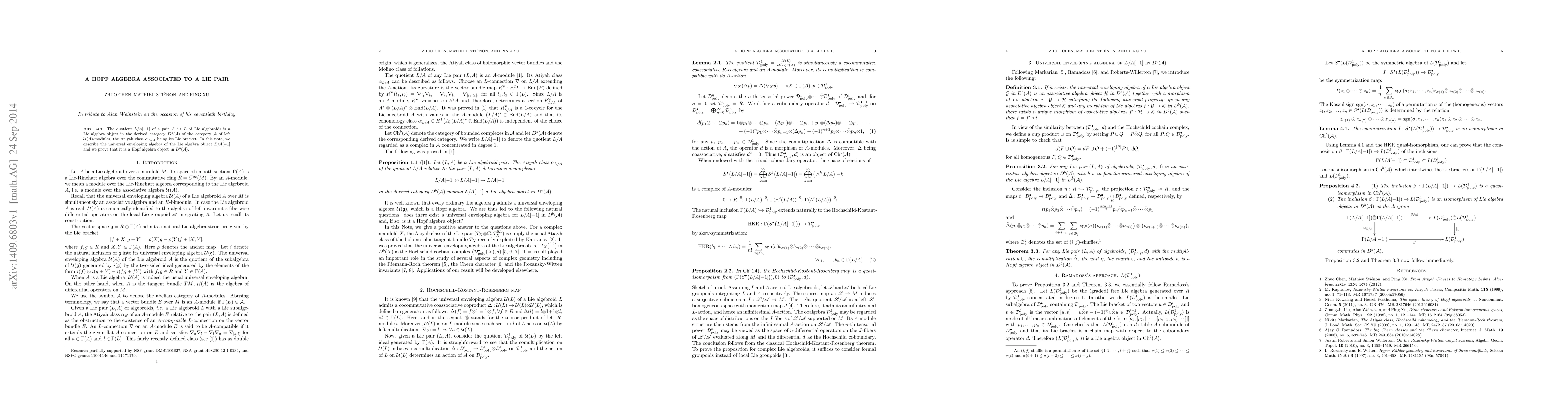 This paper explores the quotient $L/A[-1]$ of a Lie algebroid pair $A\hookrightarrow L$, showing it forms a Lie algebra object in the derived category $D^b(\mathscr{A})$. The authors describe its universal enveloping algebra and prove it is a Hopf algebra object in $D^b(\mathscr{A})$.