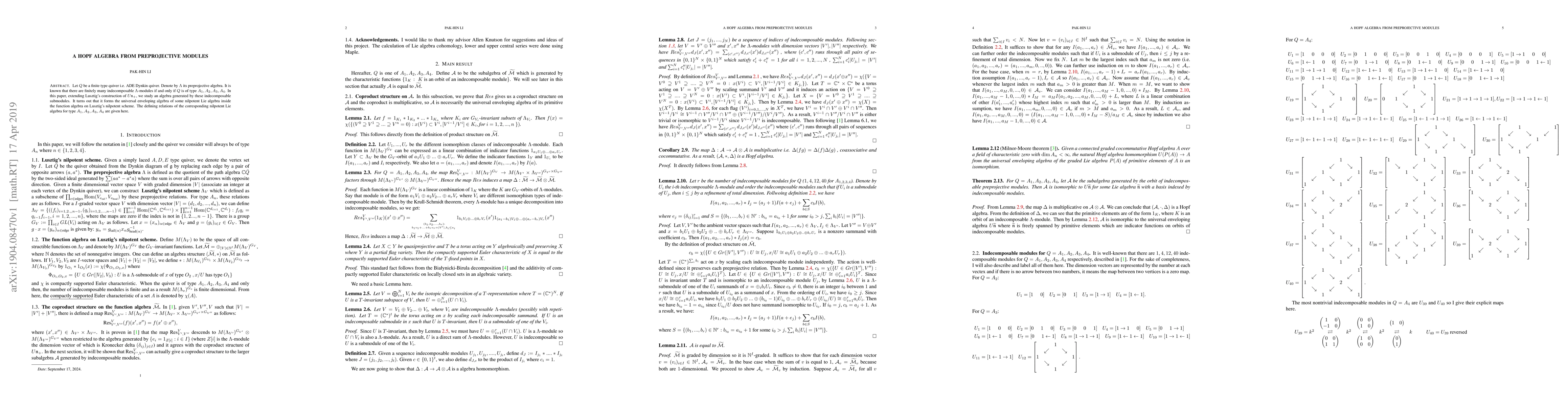 Let $Q$ be a finite type quiver i.e. ADE Dynkin quiver. Denote by $\Lambda$ its preprojective algebra. It is known that there are finitely many indecomposable $\Lambda$-modules if and only if $Q$ is of type $A_1,A_2,A_3,A_4$. In this paper, extending Lusztig's construction of $U\frak{n}_+$, we study an algebra generated by these indecomposable submodules. It turns out that it forms the universal enveloping algebra of some nilpotent Lie algebra inside the function algebra on Lusztig's nilpotent scheme. The defining relations of the corresponding nilpotent Lie algebra for type $A_1, A_2,A_3,A_4$ are given here.