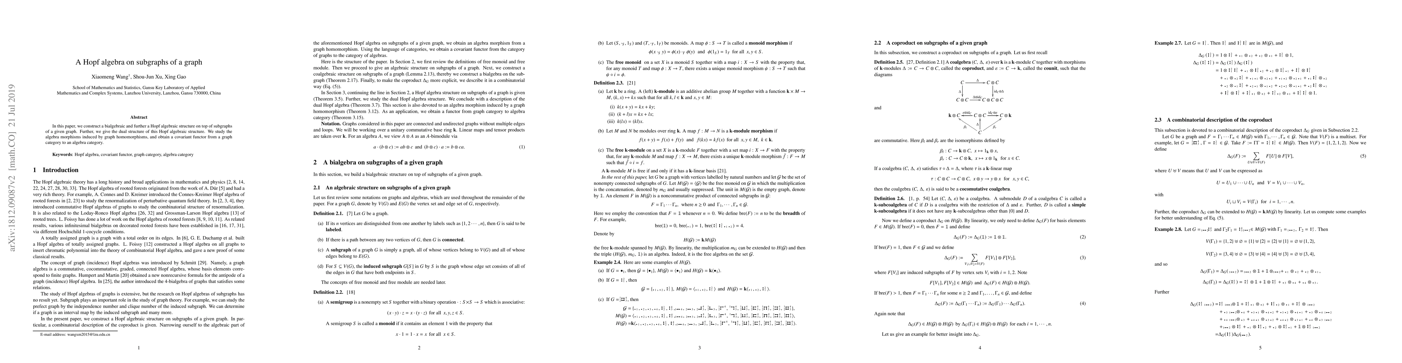 The paper presents a detailed construction and proof of a Hopf algebra on subgraphs of a graph, including the dual Hopf algebra and the algebra morphisms induced by graph homomorphisms.