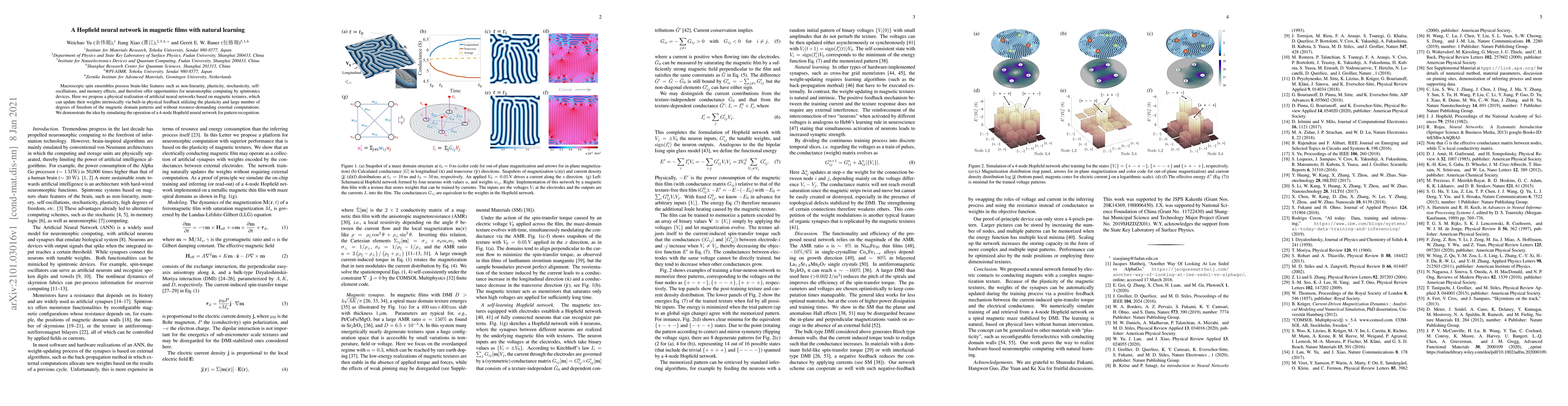 The paper presents a method to implement a Hopfield neural network using magnetic textures with intrinsic weight updates via built-in physical feedback.