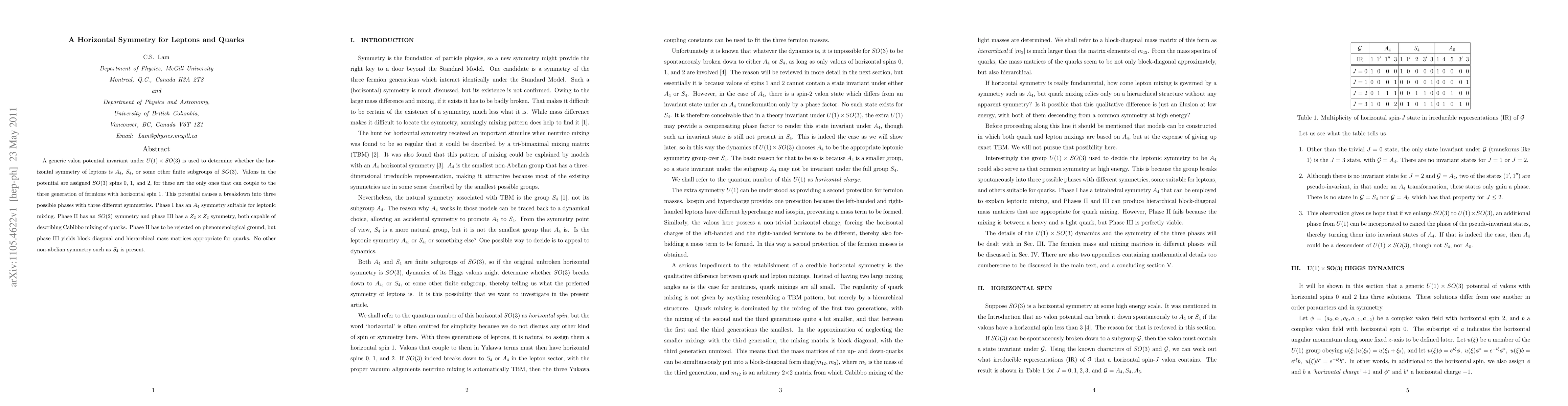 This paper explores the horizontal symmetry of leptons and quarks using a valon potential invariant under U(1) × SO(3), identifying three possible symmetry phases: $A_4$ for leptonic mixing, SO(2) for quark mixing, and $Z_2 × Z_2$ for hierarchical quark mass matrices. Phase II is rejected on phenomenological grounds.