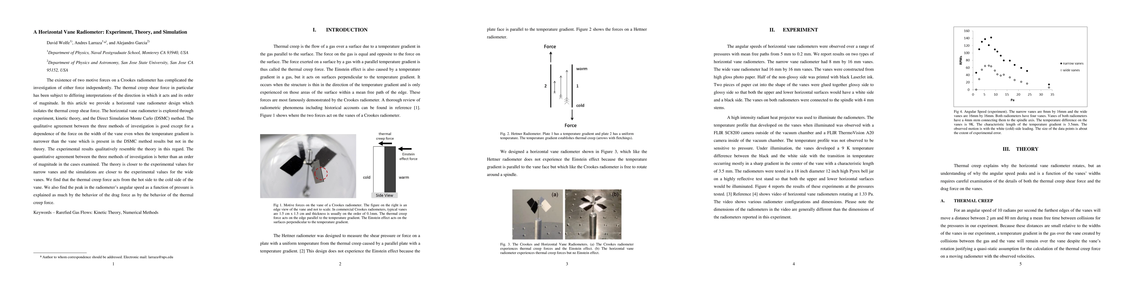 Researchers developed a horizontal vane radiometer to isolate the thermal creep shear force in Crookes radiometers, using experiment, kinetic theory, and simulation. The results show that the thermal creep force acts from hot to cold side of the vane and agree better with simulations for wide vanes than narrow ones.