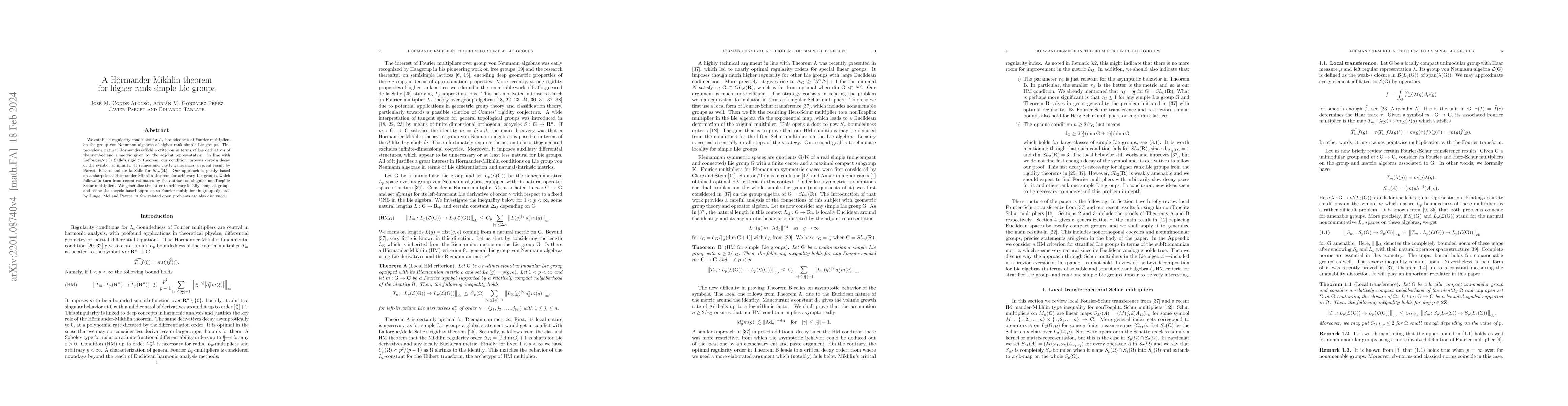 This paper establishes regularity conditions for $L_p$-boundedness of Fourier multipliers on the von Neumann algebras of high rank simple Lie groups, providing a H\"ormander-Mikhlin criterion based on Lie derivatives and a metric from the adjoint representation. It generalizes prior work and aligns with rigidity theorems, discussing related open problems.