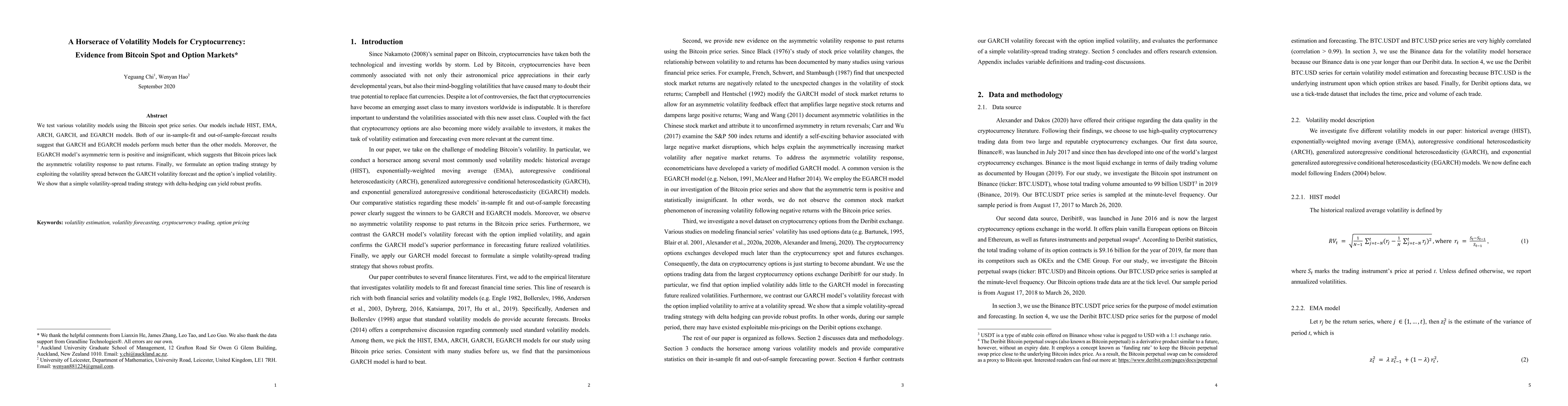 The study compares several volatility models (HIST, EMA ARCH, GARCH, EGARCH) on Bitcoin's spot price, finding GARCH and EGARCH superior for both in-sample fit and out-of-sample forecasts. A simple trading strategy exploiting volatility spreads between GARCH forecasts and option implied volatilities yields profitable results.