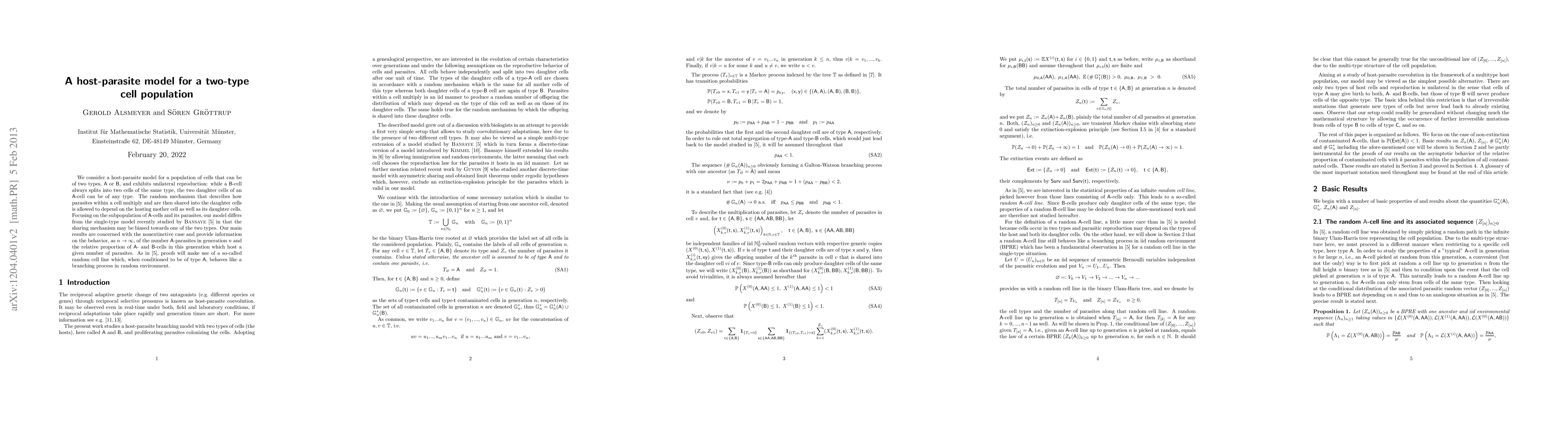 A host-parasite model is developed for a population of two types of cells, A and B, with varying reproduction and parasite sharing mechanisms. The study focuses on the dynamics of A-cell parasites as the population size increases.