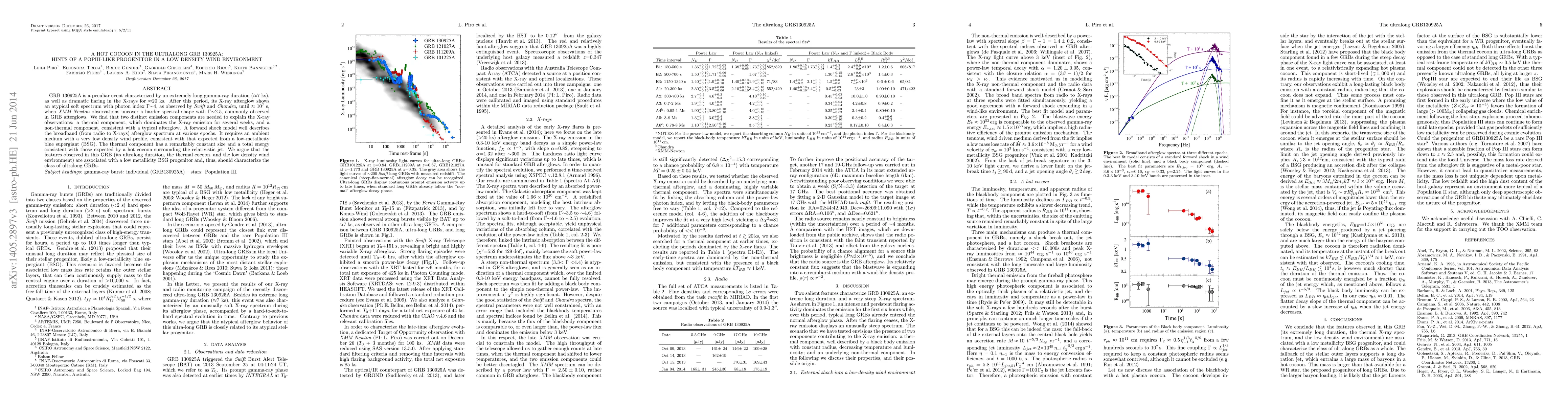 GRB 130925A is a peculiar event characterized by an extremely long gamma-ray duration ($\approx$7 ks), as well as dramatic flaring in the X-rays for $\approx$20 ks. After this period, its X-ray afterglow shows an atypical soft spectrum with photon index $\Gamma$$\sim$4, as observed by Swift and Chandra, until $\approx 10^7$ s, when XMM-Newton observations uncover a harder spectral shape with $\Gamma$$\sim$2.5, commonly observed in GRB afterglows. We find that two distinct emission components are needed to explain the X-ray observations: a thermal component, which dominates the X-ray emission for several weeks, and a non-thermal component, consistent with a typical afterglow. A forward shock model well describes the broadband (from radio to X-rays) afterglow spectrum at various epochs. It requires an ambient medium with a very low density wind profile, consistent with that expected from a low-metallicity blue supergiant (BSG). The thermal component has a remarkably constant size and a total energy consistent with those expected by a hot cocoon surrounding the relativistic jet. We argue that the features observed in this GRB (its ultralong duration, the thermal cocoon, and the low density wind environment) are associated with a low metallicity BSG progenitor and, thus, should characterize the class of ultralong GRBs.