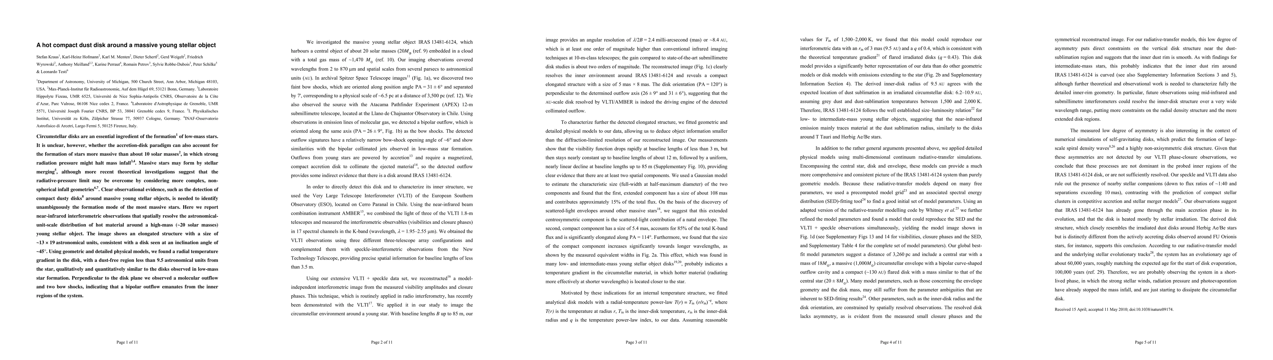 This paper reports the detection of a hot, compact dust disk around a massive young stellar object, providing evidence for a disk-like structure similar to those in low-mass star formation. Observations reveal an elongated disk with a radial temperature gradient and a molecular outflow, suggesting that massive stars may form via accretion in complex geometries.