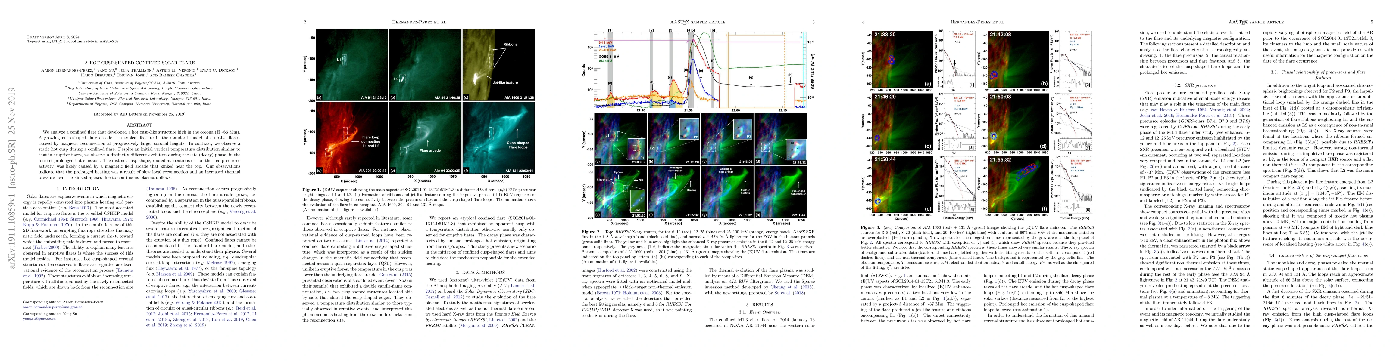 We analyze a confined flare that developed a hot cusp-like structure high in the corona (H ~ 66 Mm). A growing cusp-shaped flare arcade is a typical feature in the standard model of eruptive flares, caused by magnetic reconnection at progressively larger coronal heights. In contrast, we observe a static hot cusp during a confined flare. Despite an initial vertical temperature distribution similar to that in eruptive flares, we observe a distinctly different evolution during the late (decay) phase, in the form of prolonged hot emission. The distinct cusp shape, rooted at locations of non-thermal precursor activity, was likely caused by a magnetic field arcade that kinked near the top. Our observations indicate that the prolonged heating was a result of slow local reconnection and an increased thermal pressure near the kinked apexes due to continuous plasma upflows.