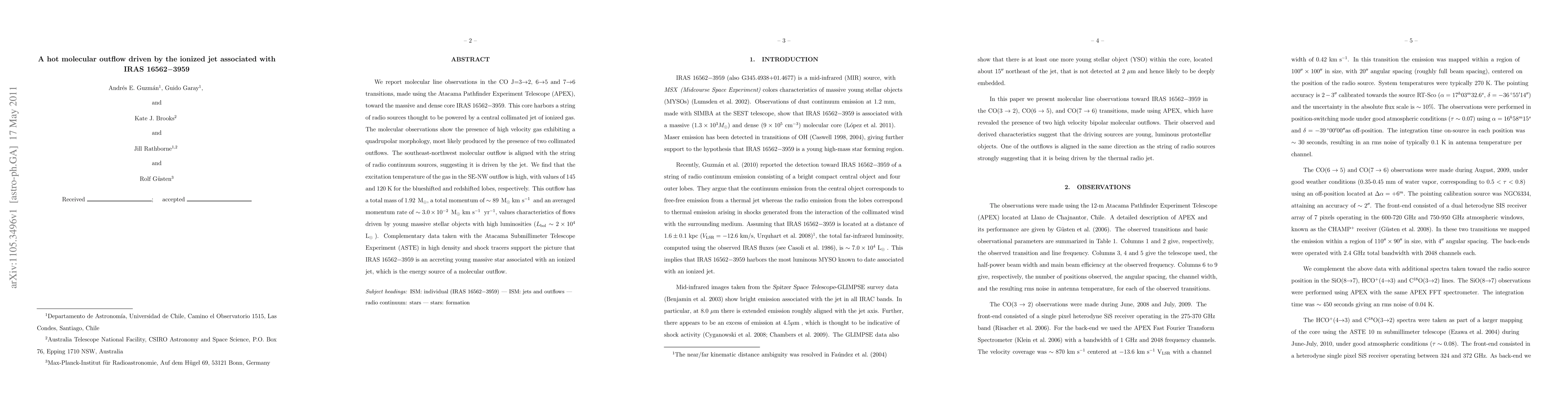 We report molecular line observations in the CO J=3$\rightarrow$2, 6$\rightarrow$5 and 7$\rightarrow$6 transitions, made using the Atacama Pathfinder Experiment Telescope (APEX), toward the massive and dense core IRAS 16562$-$3959. This core harbors a string of radio sources thought to be powered by a central collimated jet of ionized gas. The molecular observations show the presence of high velocity gas exhibiting a quadrupolar morphology, most likely produced by the presence of two collimated outflows. The southeast-northwest molecular outflow is aligned with the string of radio continuum sources, suggesting it is driven by the jet. We find that the excitation temperature of the gas in the SE-NW outflow is high, with values of 145 and 120 K for the blueshifted and redshifted lobes, respectively. This outflow has a total mass of 1.92 \Msun, a total momentum of $\sim 89$ \Msun \kms and an averaged momentum rate of $\sim 3.0\times10^{-2}$ \Msun \kms yr$^{-1}$, values characteristics of flows driven by young massive stellar objects with high luminosities ($L_{\rm bol} \sim 2\times10^4$ \Lsun). Complementary data taken with the Atacama Submillimeter Telescope Experiment (ASTE) in high density and shock tracers support the picture that IRAS 16562$-$3959 is an accreting young massive star associated with an ionized jet, which is the energy source of a molecular outflow.