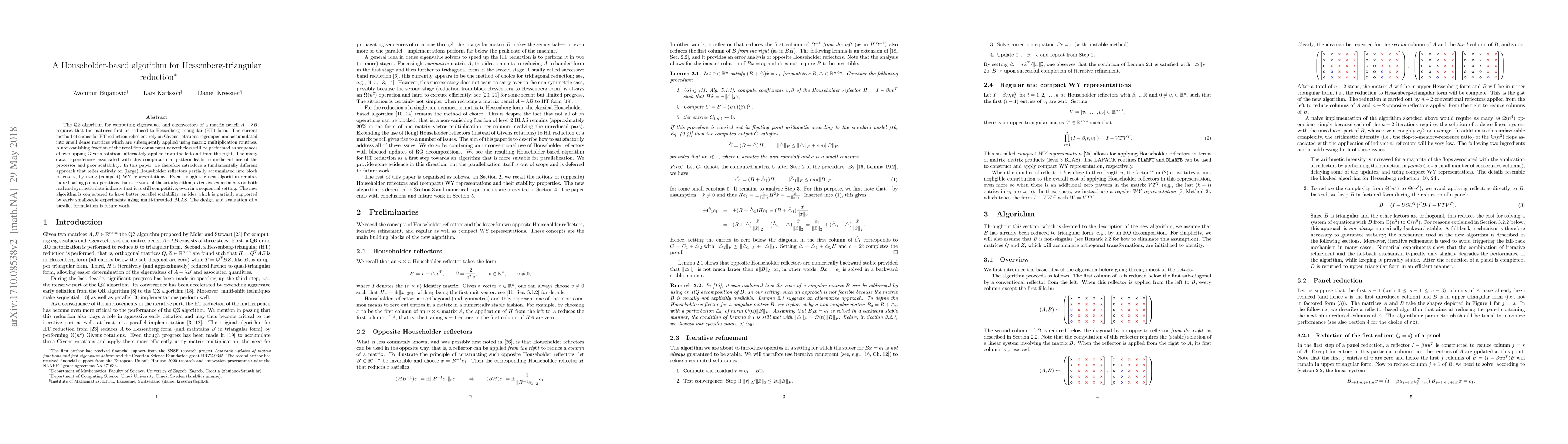 A new algorithm for Hessenberg-triangular reduction uses large Householder reflectors to improve scalability and efficiency, offering competitive performance despite increased floating-point operations.