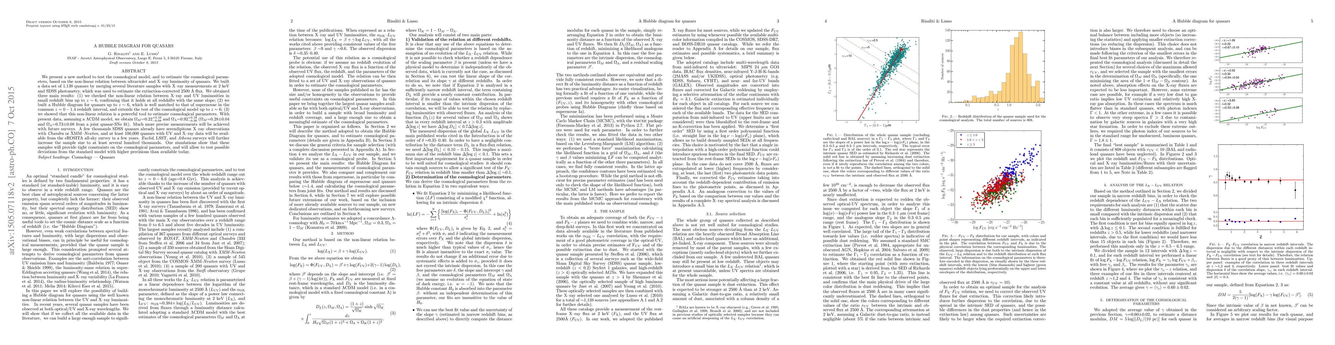 We present a new method to test the cosmological model, based on the non-linear relation between ultraviolet and X-ray luminosity of quasars. We built a data set of ~1,138 quasars by merging several literature samples with X-ray measurements at 2 keV and SDSS photometry, which was used to estimate the extinction-corrected 2500 Angstrom flux. We obtained three main results: (1) we checked the relation between X-ray and UV luminosities in small redshift bins up to z~6, confirming that it holds at all redshifts with the same slope; (2) we built a Hubble diagram for quasars up to z~6, which is well matched to that of supernovae in the common z=0-1.4 interval, and extends the test of the cosmological model up to z~6; (3) we showed that this relation is a powerful tool to estimate cosmological parameters. Assuming a LambdaCDM model, we obtain Omega_M=0.22+0.08-0.10 and Omega_Lambda=0.92+0.18-0.30 (Omega_M=0.28+-0.04 and Omega_\Lambda=0.73+-0.08 from a joint quasar-SNe fit). However, much more precise measurements will be achieved in the future. A few thousands SDSS quasars already have serendipitous X-ray observations with Chandra or XMM-Newton, and at least 100,000 quasars with UV and X-ray data will be available from the eROSITA all-sky survey in a few years. Euclid, LSST, and Athena surveys will further increase the sample size to at least several hundred thousands. Our simulations show that these samples will provide tight constraints on the cosmological parameters, and will allow to test possible deviations from the standard model with higher precisions than available today.