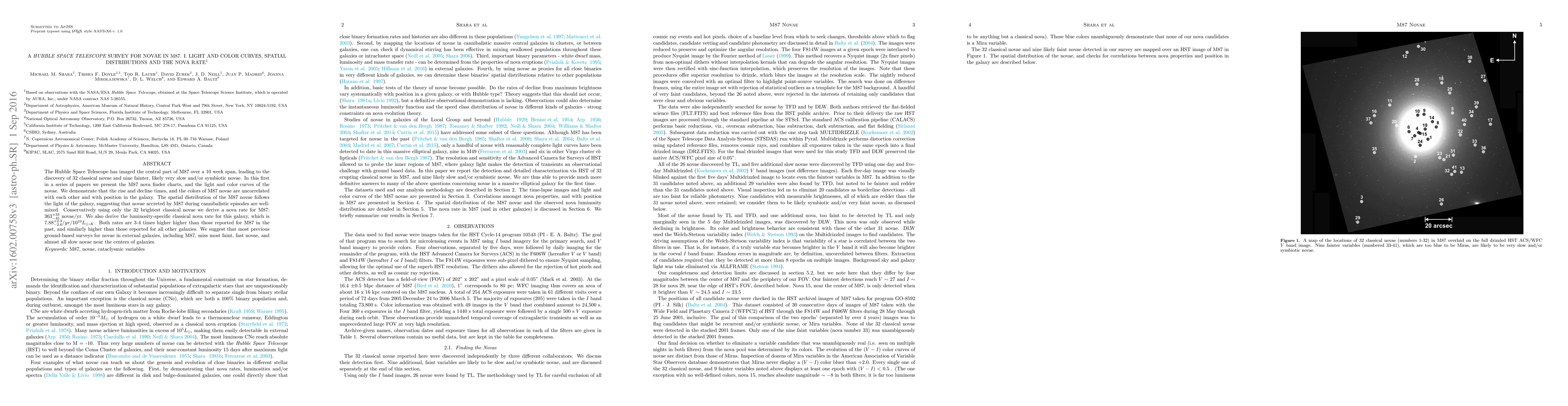 This Hubble Space Telescope survey of M87 discovered 32 classical novae and nine fainter, likely slow or symbiotic novae, revealing a nova rate 3-4 times higher than previous estimates. The study finds that the spatial distribution of novae correlates with the galaxy's light, suggesting well-mixed accreted material.