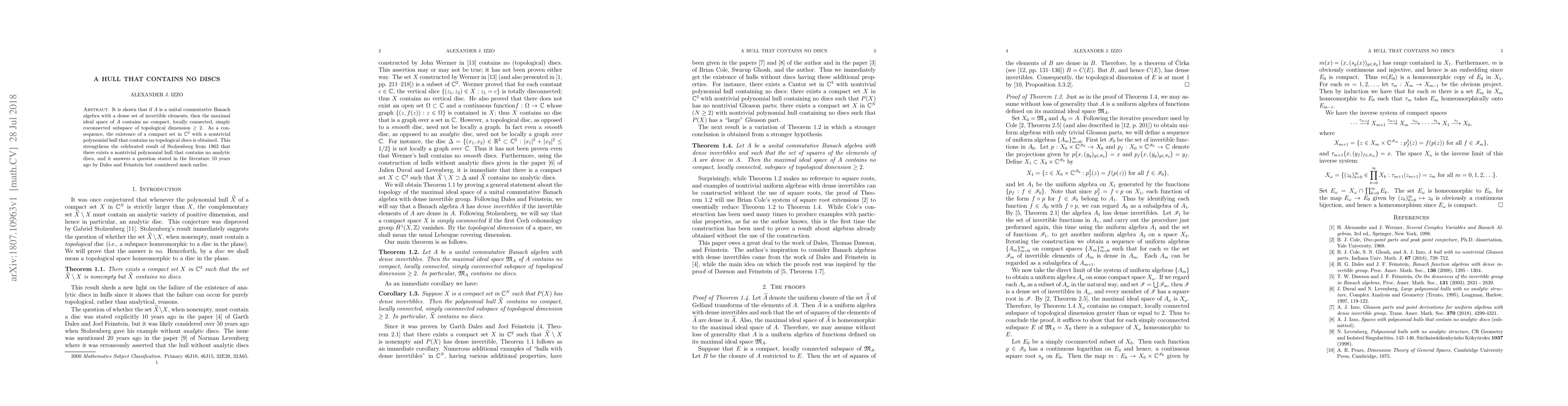 It is shown that if $A$ is a unital commutative Banach algebra with a dense set of invertible elements, then the maximal ideal space of $A$ contains no compact, locally connected, simply coconnected subspace of topological dimension $\geq 2$. As a consequence, the existence of a compact set in ${\mathbb C}^2$ with a nontrivial polynomial hull that contains no topological discs is obtained. This strengthens the celebrated result of Stolzenberg from 1963 that there exists a nontrivial polynomial hull that contains no analytic discs, and it answers a question stated in the literature 10 years ago by Dales and Feinstein but considered much earlier.