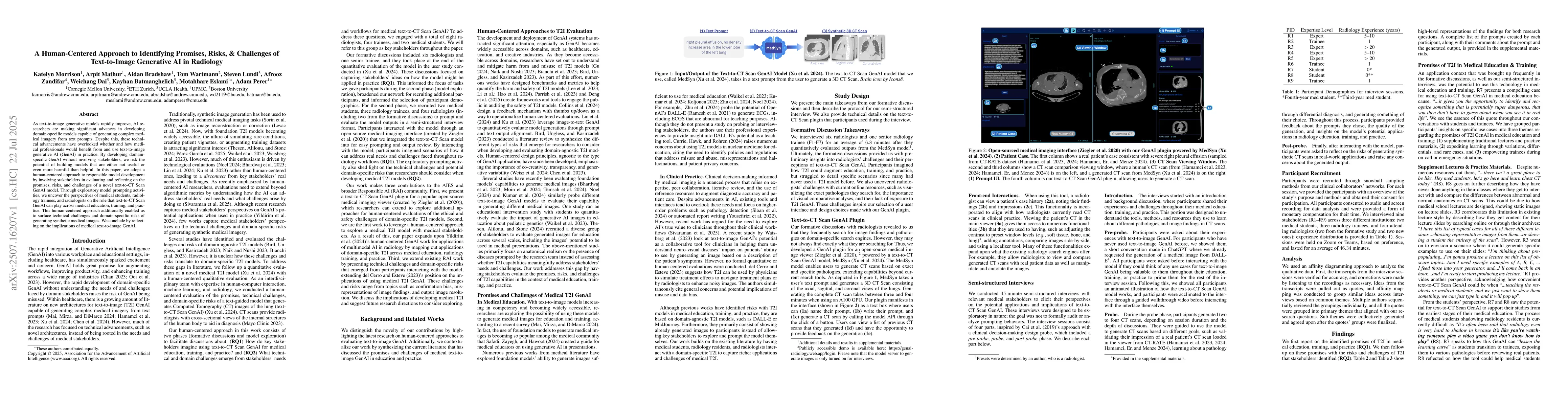 As text-to-image generative models rapidly improve, AI researchers are making significant advances in developing domain-specific models capable of generating complex medical imagery from text prompts. Despite this, these technical advancements have overlooked whether and how medical professionals would benefit from and use text-to-image generative AI (GenAI) in practice. By developing domain-specific GenAI without involving stakeholders, we risk the potential of building models that are either not useful or even more harmful than helpful. In this paper, we adopt a human-centered approach to responsible model development by involving stakeholders in evaluating and reflecting on the promises, risks, and challenges of a novel text-to-CT Scan GenAI model. Through exploratory model prompting activities, we uncover the perspectives of medical students, radiology trainees, and radiologists on the role that text-to-CT Scan GenAI can play across medical education, training, and practice. This human-centered approach additionally enabled us to surface technical challenges and domain-specific risks of generating synthetic medical images. We conclude by reflecting on the implications of medical text-to-image GenAI.