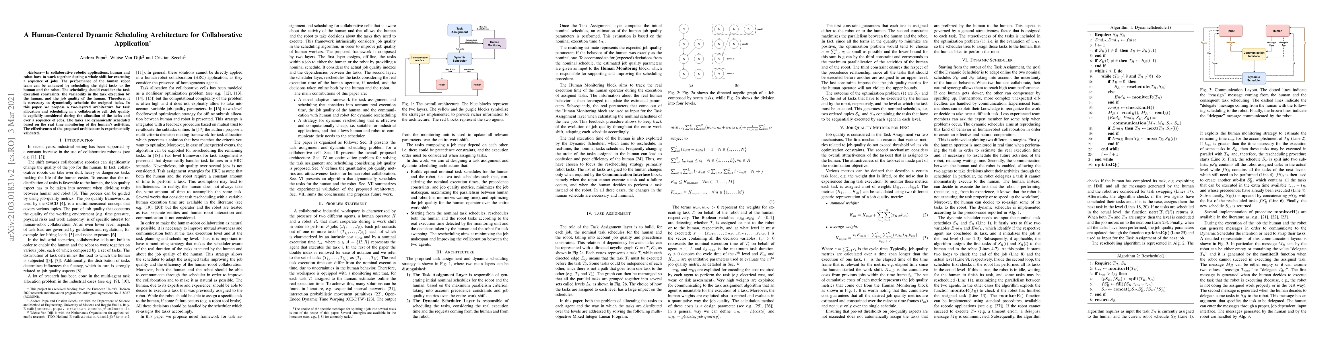 This paper proposes a two-layered architecture for dynamic scheduling in collaborative robotic applications, focusing on optimizing task allocation between humans and robots. The architecture considers job quality and real-time human activity monitoring to enhance team performance. Experimental validation demonstrates its effectiveness.