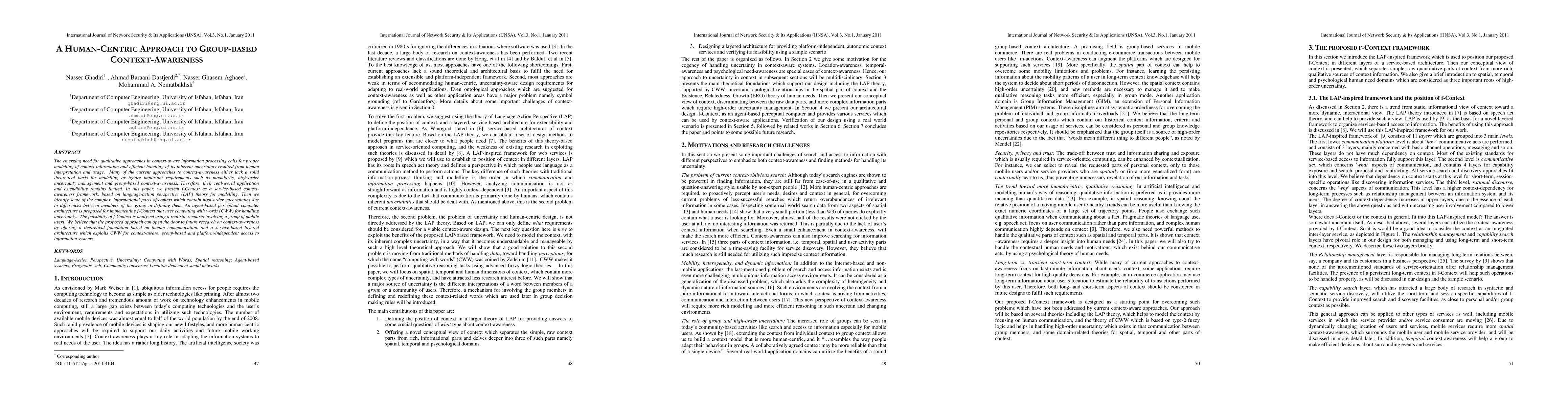 This paper introduces f-Context, a service-based framework for group-based context-awareness grounded in language-action perspective theory, addressing uncertainties in human interpretation and usage. The proposed agent-based architecture leverages computing with words to manage high-order uncertainties, demonstrated through a scenario involving mobile users.