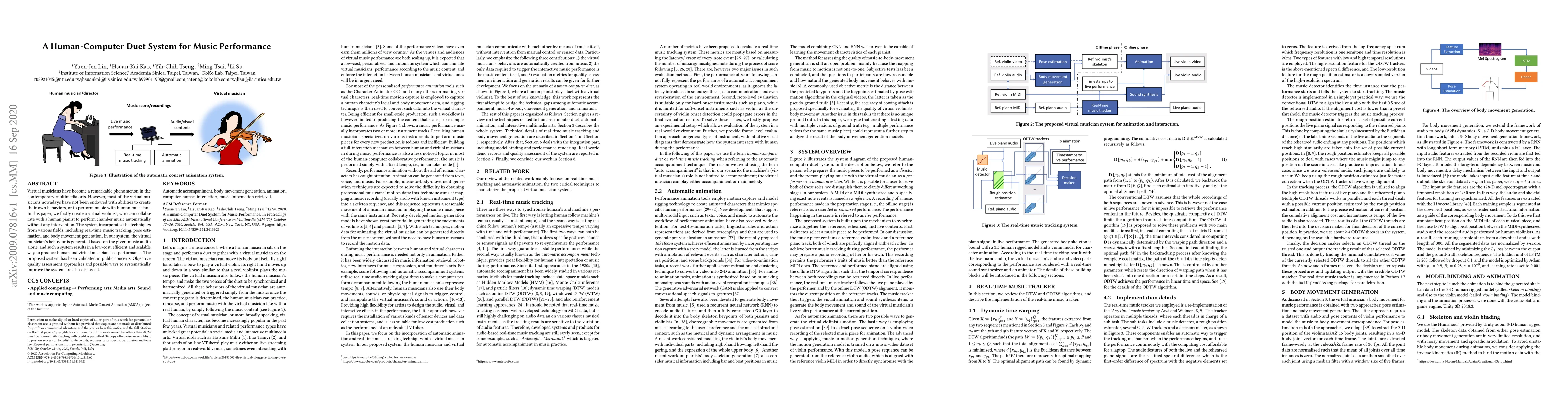 Virtual musicians have become a remarkable phenomenon in the contemporary multimedia arts. However, most of the virtual musicians nowadays have not been endowed with abilities to create their own behaviors, or to perform music with human musicians. In this paper, we firstly create a virtual violinist, who can collaborate with a human pianist to perform chamber music automatically without any intervention. The system incorporates the techniques from various fields, including real-time music tracking, pose estimation, and body movement generation. In our system, the virtual musician's behavior is generated based on the given music audio alone, and such a system results in a low-cost, efficient and scalable way to produce human and virtual musicians' co-performance. The proposed system has been validated in public concerts. Objective quality assessment approaches and possible ways to systematically improve the system are also discussed.