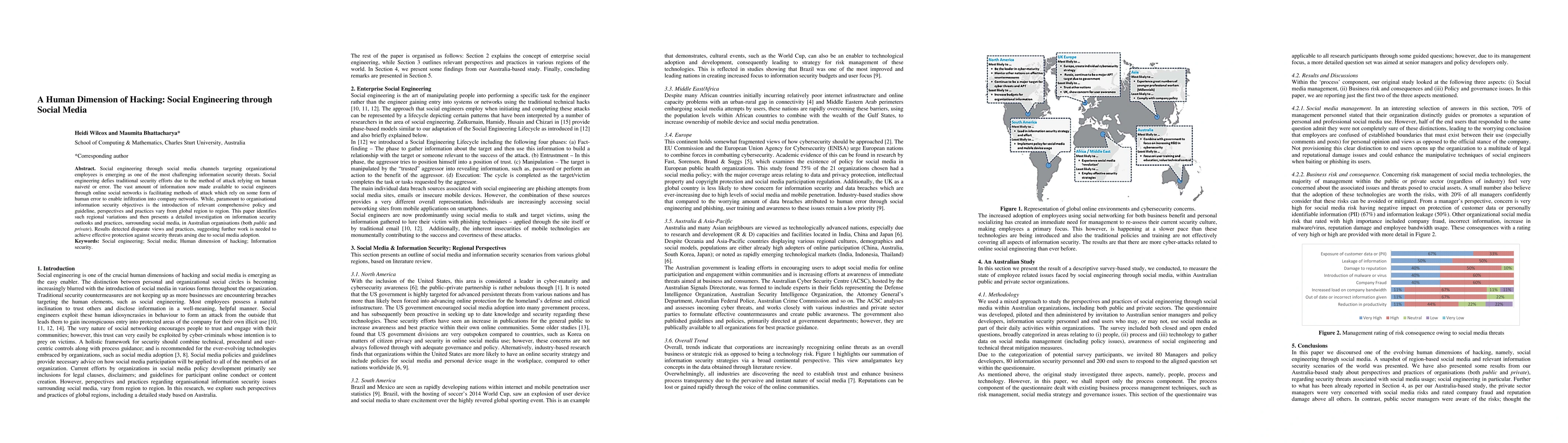 This paper explores the growing threat of social engineering via social media, emphasizing its reliance on human error. It investigates regional variations in information security practices, focusing on Australian organizations, and finds that disparate views and practices necessitate further efforts to enhance security against social media-related threats.