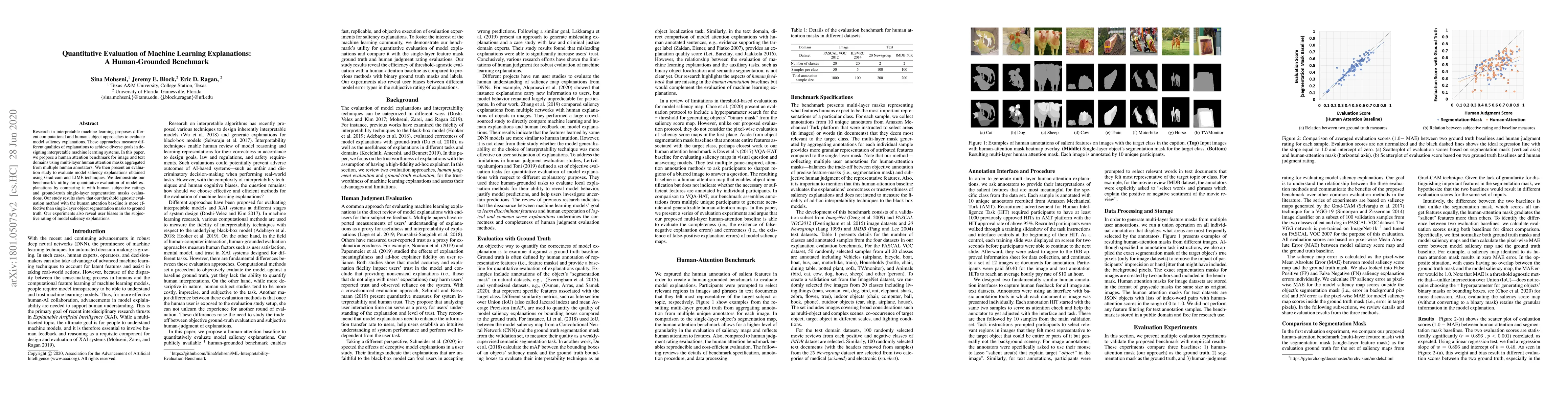 Research in interpretable machine learning proposes different computational and human subject approaches to evaluate model saliency explanations. These approaches measure different qualities of explanations to achieve diverse goals in designing interpretable machine learning systems. In this paper, we propose a human attention benchmark for image and text domains using multi-layer human attention masks aggregated from multiple human annotators. We then present an evaluation study to evaluate model saliency explanations obtained using Grad-cam and LIME techniques. We demonstrate our benchmark's utility for quantitative evaluation of model explanations by comparing it with human subjective ratings and ground-truth single-layer segmentation masks evaluations. Our study results show that our threshold agnostic evaluation method with the human attention baseline is more effective than single-layer object segmentation masks to ground truth. Our experiments also reveal user biases in the subjective rating of model saliency explanations.