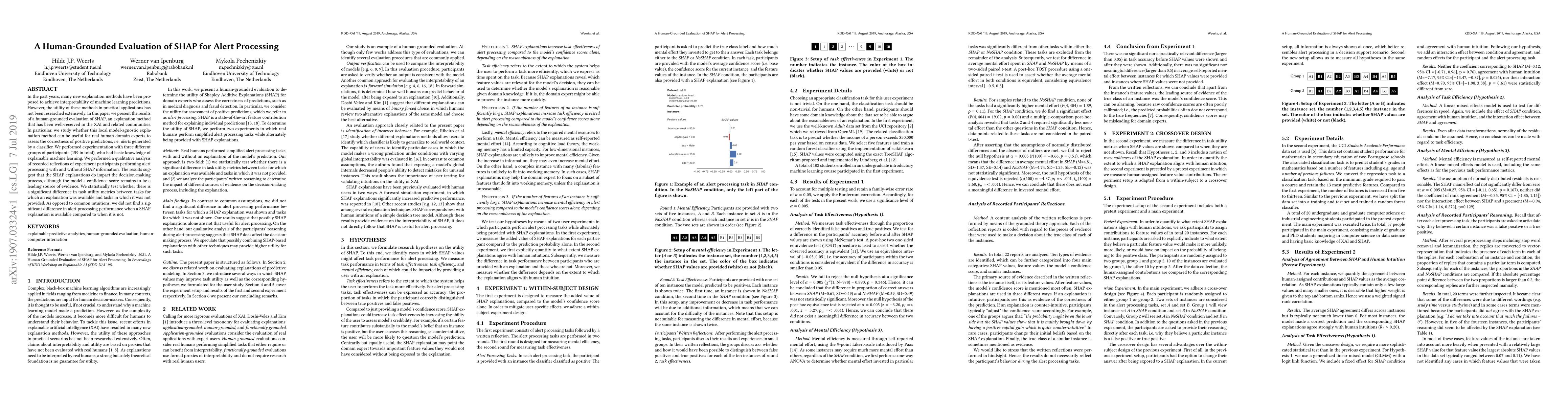 In the past years, many new explanation methods have been proposed to achieve interpretability of machine learning predictions. However, the utility of these methods in practical applications has not been researched extensively. In this paper we present the results of a human-grounded evaluation of SHAP, an explanation method that has been well-received in the XAI and related communities. In particular, we study whether this local model-agnostic explanation method can be useful for real human domain experts to assess the correctness of positive predictions, i.e. alerts generated by a classifier. We performed experimentation with three different groups of participants (159 in total), who had basic knowledge of explainable machine learning. We performed a qualitative analysis of recorded reflections of experiment participants performing alert processing with and without SHAP information. The results suggest that the SHAP explanations do impact the decision-making process, although the model's confidence score remains to be a leading source of evidence. We statistically test whether there is a significant difference in task utility metrics between tasks for which an explanation was available and tasks in which it was not provided. As opposed to common intuitions, we did not find a significant difference in alert processing performance when a SHAP explanation is available compared to when it is not.