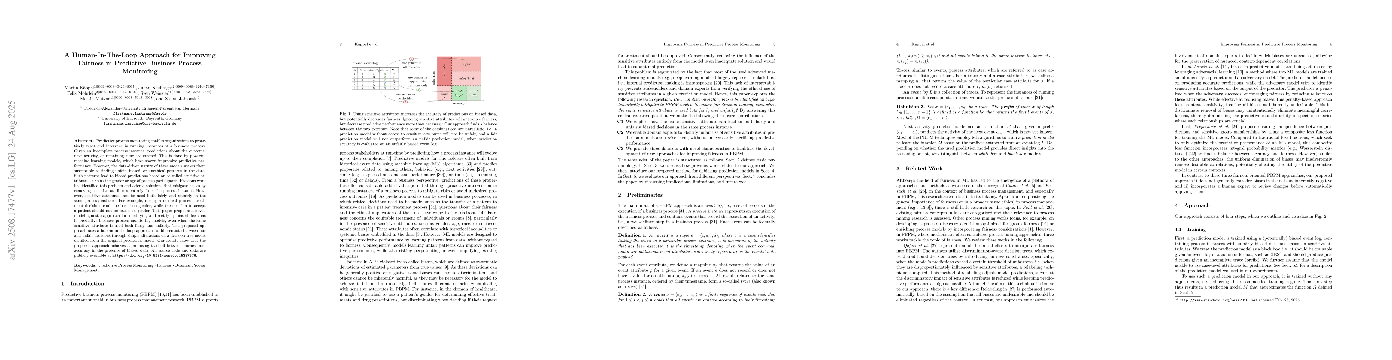 Predictive process monitoring enables organizations to proactively react and intervene in running instances of a business process. Given an incomplete process instance, predictions about the outcome, next activity, or remaining time are created. This is done by powerful machine learning models, which have shown impressive predictive performance. However, the data-driven nature of these models makes them susceptible to finding unfair, biased, or unethical patterns in the data. Such patterns lead to biased predictions based on so-called sensitive attributes, such as the gender or age of process participants. Previous work has identified this problem and offered solutions that mitigate biases by removing sensitive attributes entirely from the process instance. However, sensitive attributes can be used both fairly and unfairly in the same process instance. For example, during a medical process, treatment decisions could be based on gender, while the decision to accept a patient should not be based on gender. This paper proposes a novel, model-agnostic approach for identifying and rectifying biased decisions in predictive business process monitoring models, even when the same sensitive attribute is used both fairly and unfairly. The proposed approach uses a human-in-the-loop approach to differentiate between fair and unfair decisions through simple alterations on a decision tree model distilled from the original prediction model. Our results show that the proposed approach achieves a promising tradeoff between fairness and accuracy in the presence of biased data. All source code and data are publicly available at https://doi.org/10.5281/zenodo.15387576.