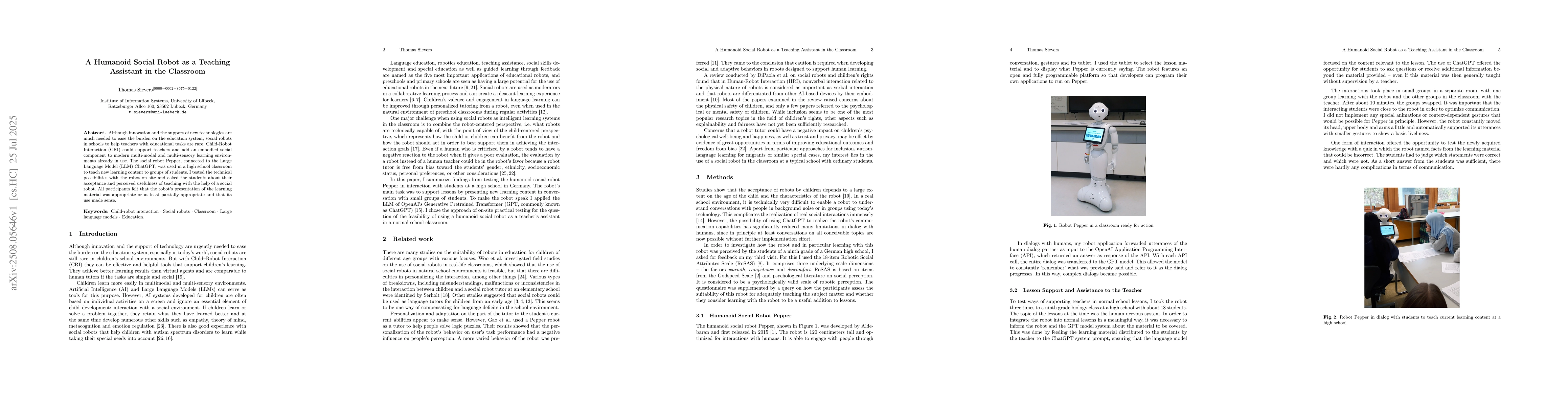 Although innovation and the support of new technologies are much needed to ease the burden on the education system, social robots in schools to help teachers with educational tasks are rare. Child-Robot Interaction (CRI) could support teachers and add an embodied social component to modern multi-modal and multi-sensory learning environments already in use. The social robot Pepper, connected to the Large Language Model (LLM) ChatGPT, was used in a high school classroom to teach new learning content to groups of students. I tested the technical possibilities with the robot on site and asked the students about their acceptance and perceived usefulness of teaching with the help of a social robot. All participants felt that the robot's presentation of the learning material was appropriate or at least partially appropriate and that its use made sense.