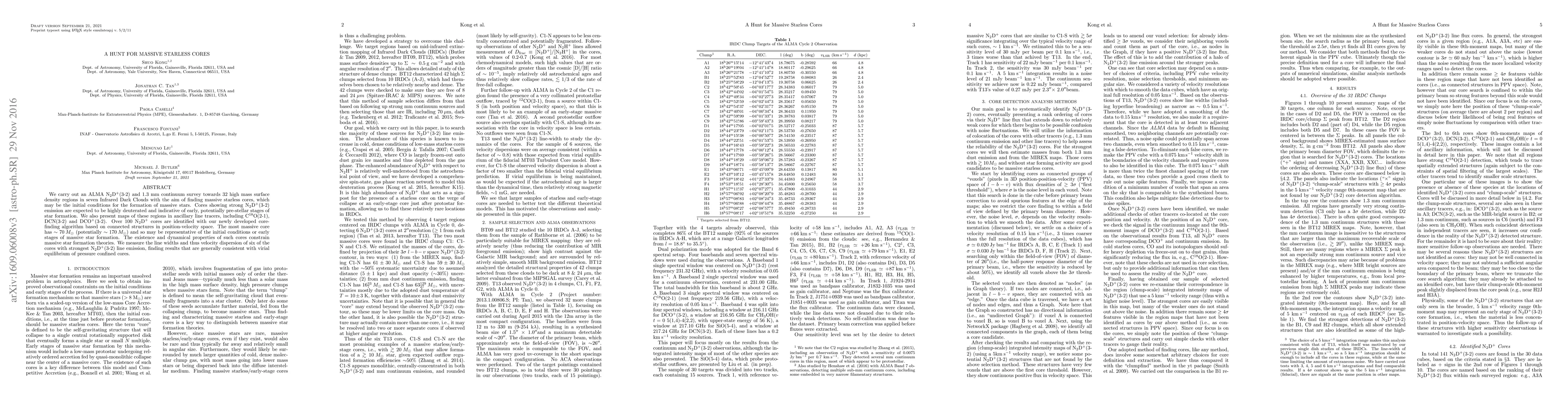 We carry out an ALMA $\rm N_2D^+$(3-2) and 1.3~mm continuum survey towards 32 high mass surface density regions in seven Infrared Dark Clouds with the aim of finding massive starless cores, which may be the initial conditions for the formation of massive stars. Cores showing strong $\rm N_2D^+$(3-2) emission are expected to be highly deuterated and indicative of early, potentially pre-stellar stages of star formation. We also present maps of these regions in ancillary line tracers, including C$^{18}$O(2-1), DCN(3-2) and DCO$^+$(3-2). Over 100 $\rm N_2D^+$ cores are identified with our newly developed core-finding algorithm based on connected structures in position-velocity space. The most massive core has $\sim70\:M_\odot$ (potentially $\sim170\:M_\odot$) and so may be representative of the initial conditions for massive star formation. The existence and dynamical properties of such cores constrain massive star formation theories. We measure the line widths and thus velocity dispersion of six of the cores with strongest $\rm N_2D^+$(3-2) line emission, finding results that are generally consistent with virial equilibrium of pressure confined cores.