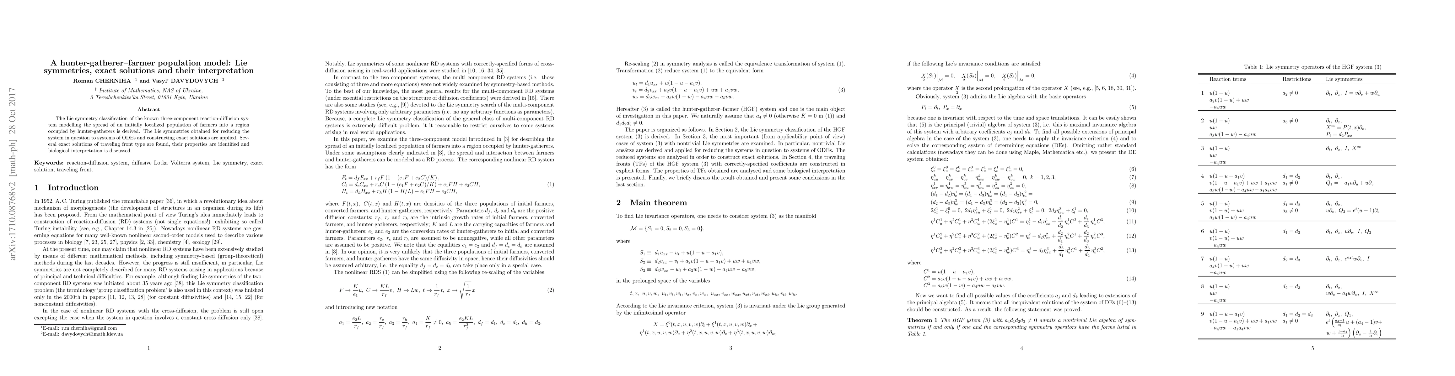 This paper derives the Lie symmetry classification for a three-component reaction-diffusion model to study the spread of farmers into a hunter-gatherer region, reducing the system to ODEs and finding exact traveling front solutions, with a focus on biological interpretation.