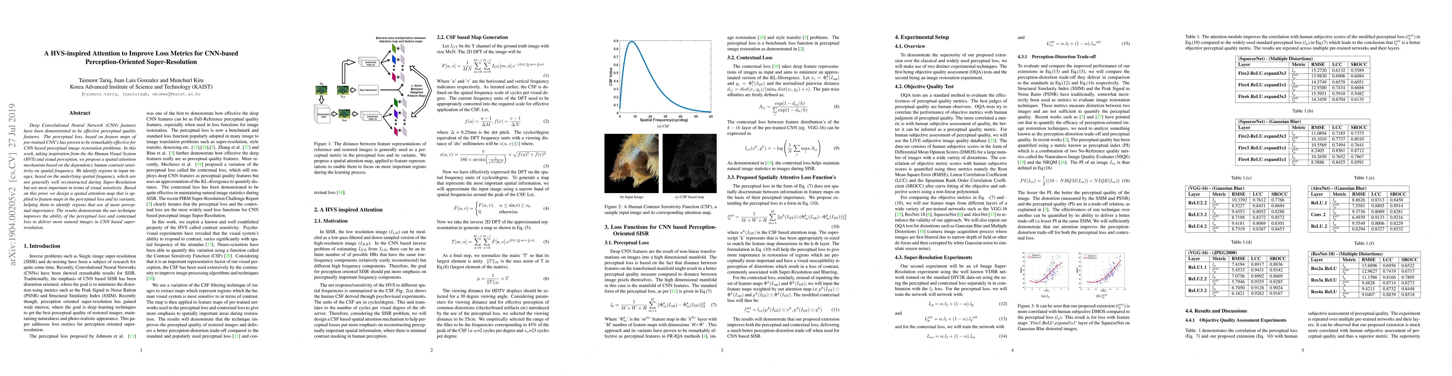 Deep Convolutional Neural Network (CNN) features have been demonstrated to be effective perceptual quality features. The perceptual loss, based on feature maps of pre-trained CNN's has proven to be remarkably effective for CNN based perceptual image restoration problems. In this work, taking inspiration from the the Human Visual System (HVS) and visual perception, we propose a spatial attention mechanism based on the dependency human contrast sensitivity on spatial frequency. We identify regions in input images, based on the underlying spatial frequency, which are not generally well reconstructed during Super-Resolution but are most important in terms of visual sensitivity. Based on this prior, we design a spatial attention map that is applied to feature maps in the perceptual loss and its variants, helping them to identify regions that are of more perceptual importance. The results demonstrate the our technique improves the ability of the perceptual loss and contextual loss to deliver more natural images in CNN based super-resolution.
