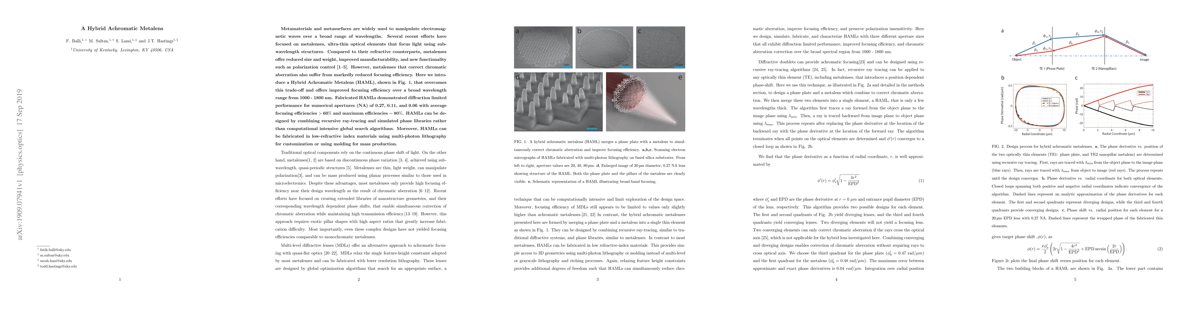 Metamaterials and metasurfaces are widely used to manipulate electromagnetic waves over a broad range of wavelengths. Several recent efforts have focused on metalenses, ultra-thin optical elements that focus light using subwavelength structures. Compared to their refractive counterparts, metalenses offer reduced size and weight, improved manufacturability, and new functionality such as polarization control. However, metalenses that correct chromatic aberration also suffer from markedly reduced focusing efficiency. Here we introduce a Hybrid Achromatic Metalens (HAML), that overcomes this trade-off and offers improved focusing efficiency over a broad wavelength range from 1000 - 1800 nm. Fabricated HAMLs demonstrated diffraction limited performance for numerical apertures (NA) of 0.27, 0.11, and 0.06 with average focusing efficiencies $> 60\%$ and maximum efficiencies ~ $ 80\%$. HAMLs can be designed by combining recursive ray-tracing and simulated phase libraries rather than computational intensive global search algorithms. Moreover, HAMLs can be fabricated in low-refractive index materials using multi-photon lithography for customization or using molding for mass production.