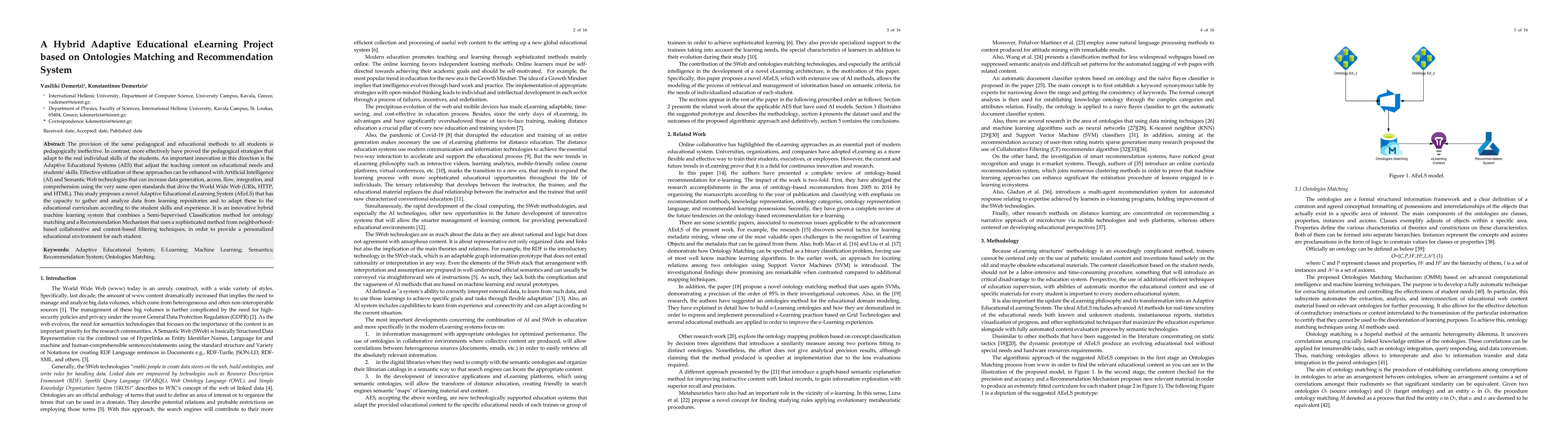 The paper presents a novel Adaptive Educational eLearning System (AEeLS) that utilizes hybrid machine learning to adapt educational content based on student skills. It combines semi-supervised classification for ontology matching and a hybrid recommendation system for personalized learning experiences.