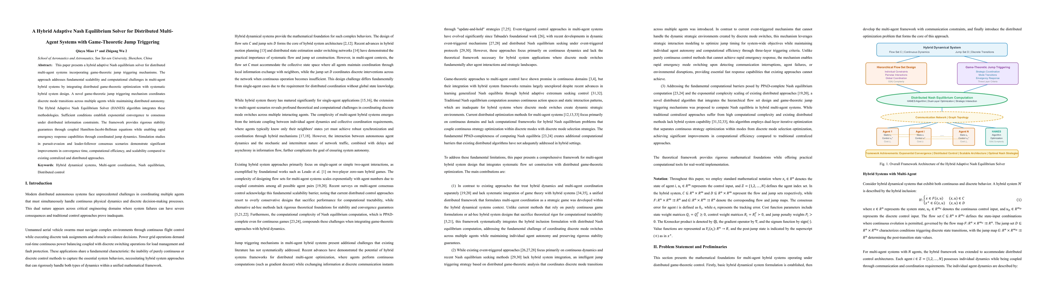 This paper presents a hybrid adaptive Nash equilibrium solver for distributed multi-agent systems incorporating game-theoretic jump triggering mechanisms. The approach addresses fundamental scalability and computational challenges in multi-agent hybrid systems by integrating distributed game-theoretic optimization with systematic hybrid system design. A novel game-theoretic jump triggering mechanism coordinates discrete mode transitions across multiple agents while maintaining distributed autonomy. The Hybrid Adaptive Nash Equilibrium Solver (HANES) algorithm integrates these methodologies. Sufficient conditions establish exponential convergence to consensus under distributed information constraints. The framework provides rigorous stability guarantees through coupled Hamilton-Jacobi-Bellman equations while enabling rapid emergency response capabilities through coordinated jump dynamics. Simulation studies in pursuit-evasion and leader-follower consensus scenarios demonstrate significant improvements in convergence time, computational efficiency, and scalability compared to existing centralized and distributed approaches.
