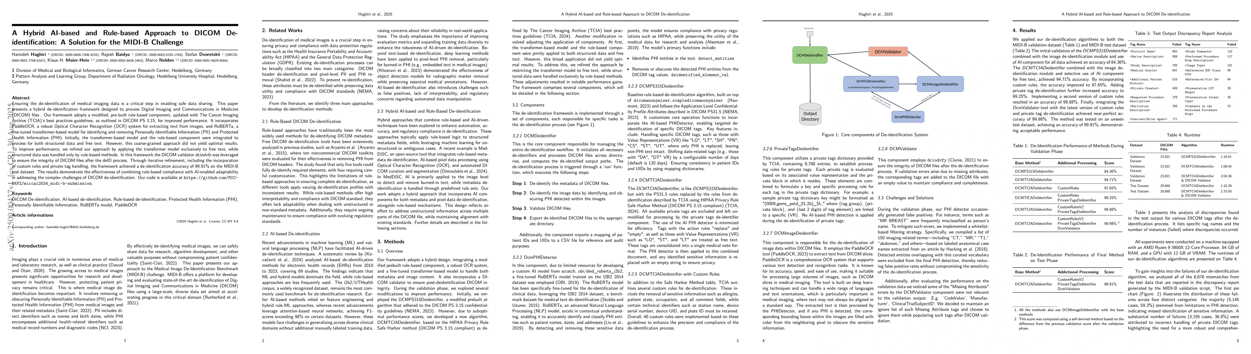 Ensuring the de-identification of medical imaging data is a critical step in enabling safe data sharing. This paper presents a hybrid de-identification framework designed to process Digital Imaging and Communications in Medicine (DICOM) files. Our framework adopts a modified, pre-built rule-based component, updated with The Cancer Imaging Archive (TCIA)'s best practices guidelines, as outlined in DICOM PS 3.15, for improved performance. It incorporates PaddleOCR, a robust Optical Character Recognition (OCR) system for extracting text from images, and RoBERTa, a fine-tuned transformer-based model for identifying and removing Personally Identifiable Information (PII) and Protected Health Information (PHI). Initially, the transformer-based model and the rule-based component were integrated to process for both structured data and free text. However, this coarse-grained approach did not yield optimal results. To improve performance, we refined our approach by applying the transformer model exclusively to free text, while structured data was handled only by rule-based methods. In this framework the DICOM validator dciodvfy was leveraged to ensure the integrity of DICOM files after the deID process. Through iterative refinement, including the incorporation of custom rules and private tag handling, the framework achieved a de-identification accuracy of 99.91% on the MIDI-B test dataset. The results demonstrate the effectiveness of combining rule-based compliance with AI-enabled adaptability in addressing the complex challenges of DICOM de-identification.