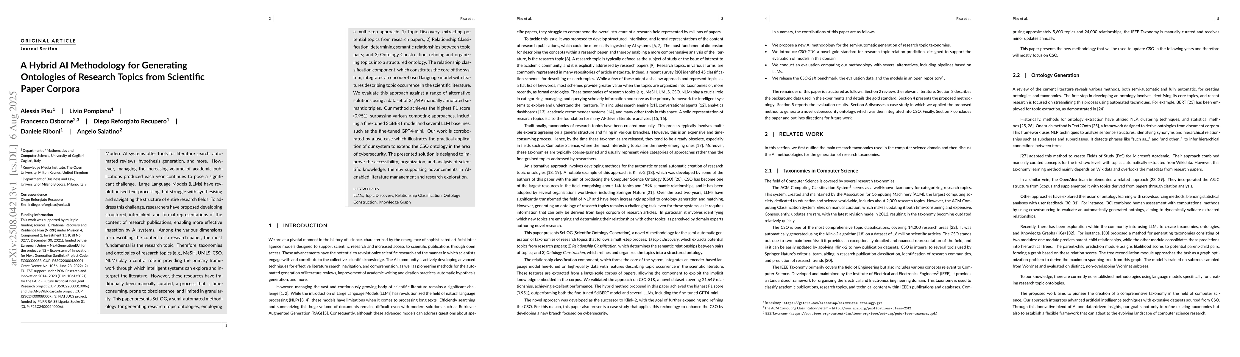 This paper introduces Sci-OG, a semi-automated method for generating research topic ontologies using a three-step process: topic discovery, relationship classification, and ontology construction. The core of the system is a relationship classification component that uses an encoder-based language model, outperforming alternatives with an F1 score of 0.951. The method is demonstrated to enhance the CSO ontology in cybersecurity, aiming to improve scientific literature accessibility and analysis for AI-driven research.