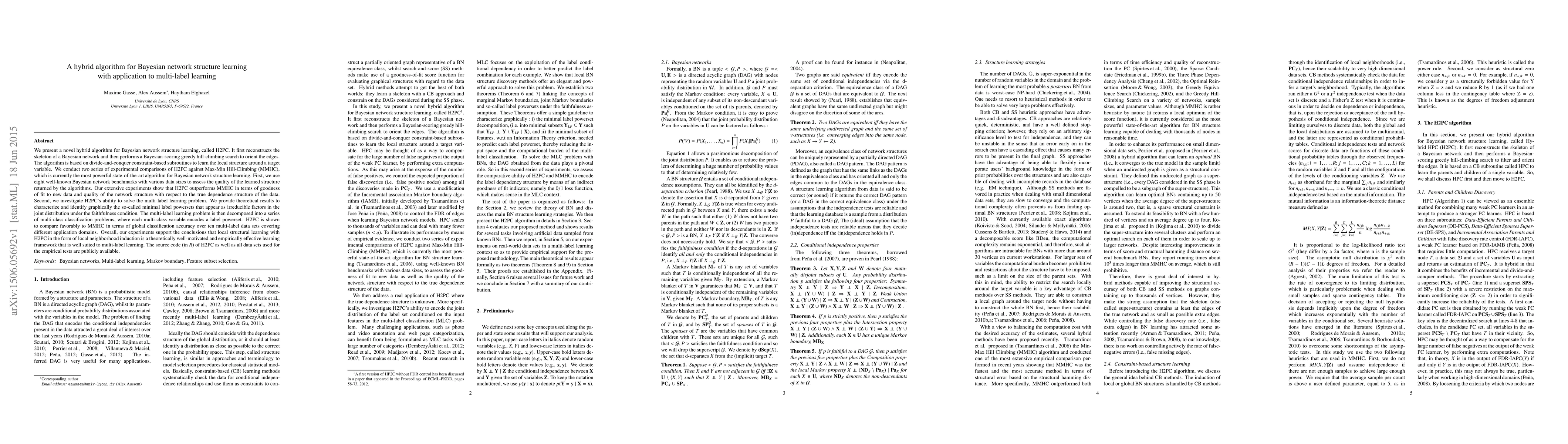 This paper introduces H2PC, a hybrid algorithm for Bayesian network structure learning that outperforms the state-of-the-art Max-Min Hill-Climbing (MMHC) algorithm in both goodness of fit and structure quality. The algorithm is also shown to be effective for multi-label learning tasks.