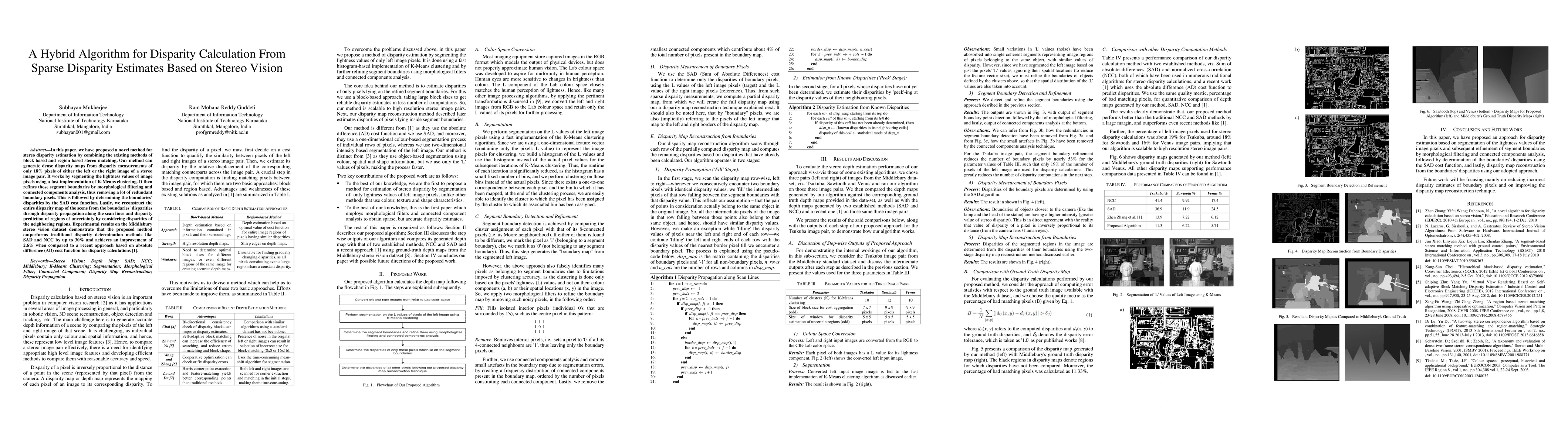 This paper proposes a hybrid algorithm that combines block-based and region-based stereo matching to generate dense disparity maps from sparse disparity estimates. The method uses K-Means clustering, morphological filtering, and disparity propagation to achieve superior results compared to traditional methods, demonstrating a 30% improvement over some.