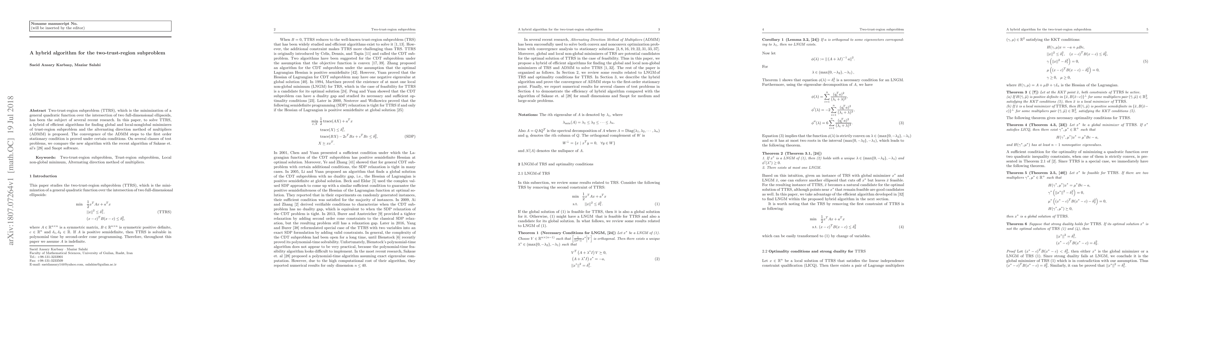 This paper proposes a hybrid algorithm combining efficient trust-region subproblem solvers and the alternating direction method of multipliers (ADMM) to solve the two-trust-region subproblem (TTRS). The algorithm's convergence to first-order stationarity is proven under specific conditions, and it is shown to outperform recent algorithms on various test problems.