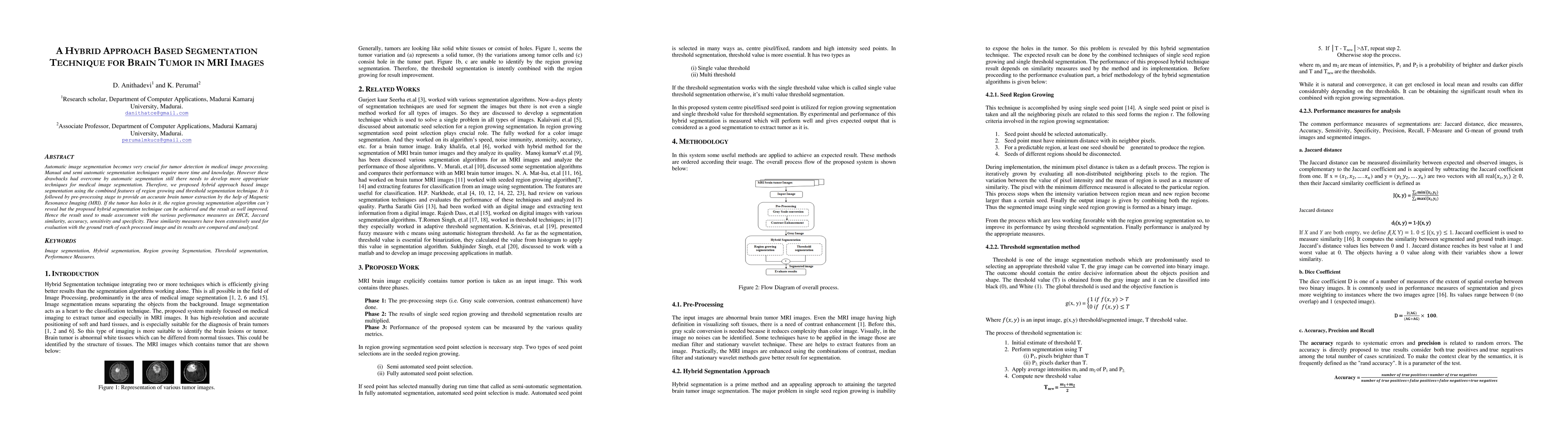 This paper proposes a hybrid segmentation technique combining region growing and threshold-based methods for automatic brain tumor detection in MRI images. The approach aims to overcome the limitations of manual and semi-automatic techniques, achieving more accurate tumor extraction, especially in cases with tumor holes, and is evaluated using performance measures like DICE, Jaccard similarity, accuracy, sensitivity, and specificity.