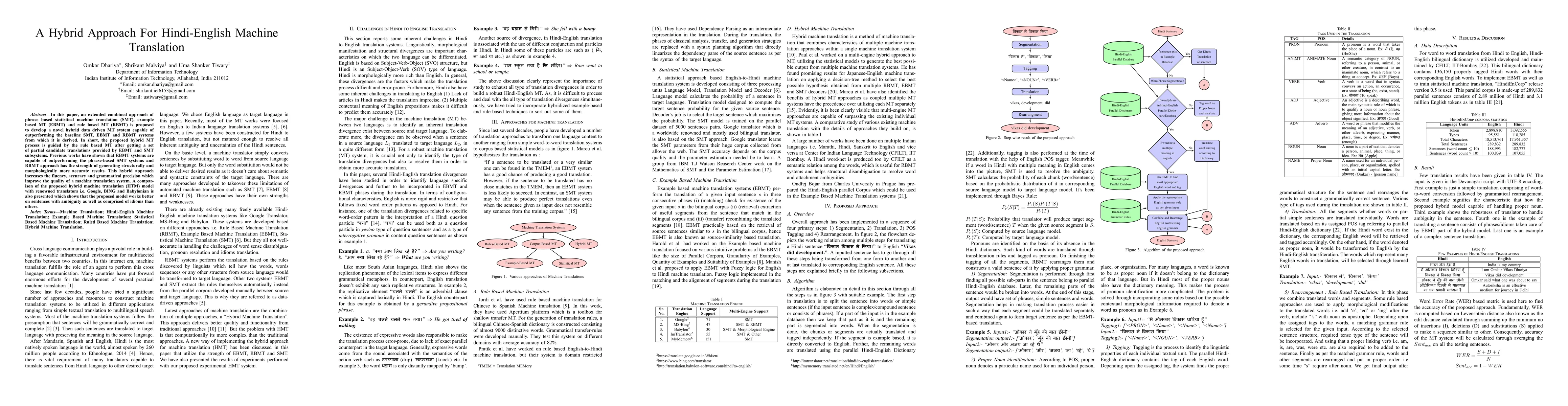 This paper proposes a hybrid machine translation system combining phrase-based SMT, example-based MT, and rule-based MT to outperform individual baseline systems. The hybrid approach enhances fluency, accuracy, and grammatical precision, outperforming Google, BING, and Babylonian on ambiguous and idiomatic sentences.
