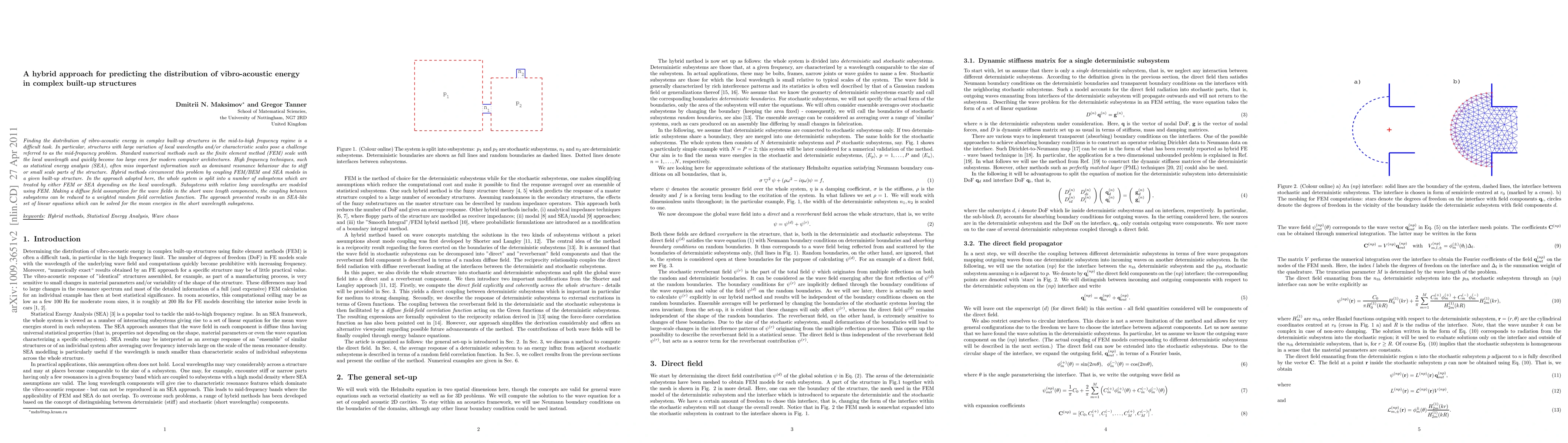 Finding the distribution of vibro-acoustic energy in complex built-up structures in the mid-to-high frequency regime is a difficult task. In particular, structures with large variation of local wavelengths and/or characteristic scales pose a challenge referred to as the mid-frequency problem. Standard numerical methods such as the finite element method (FEM) scale with the local wavelength and quickly become too large even for modern computer architectures. High frequency techniques, such as statistical energy analysis (SEA), often miss important information such as dominant resonance behaviour due to stiff or small scale parts of the structure. Hybrid methods circumvent this problem by coupling FEM/BEM and SEA models in a given built-up structure. In the approach adopted here, the whole system is split into a number of subsystems which are treated by either FEM or SEA depending on the local wavelength. Subsystems with relative long wavelengths are modelled using FEM. Making a diffuse field assumption for the wave fields in the short wave length components, the coupling between subsystems can be reduced to a weighted random field correlation function. The approach presented results in an SEA-like set of linear equations which can be solved for the mean energies in the short wavelength subsystems.