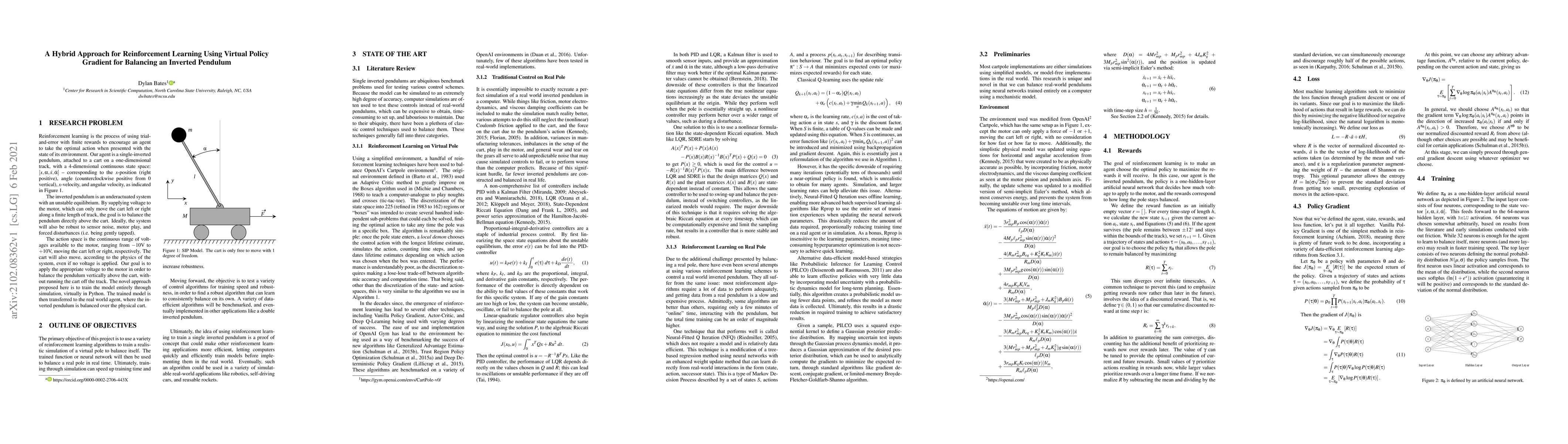 This paper presents a hybrid reinforcement learning approach using virtual policy gradient to train a neural network for balancing an inverted pendulum, achieving smoother and faster learning, and greater robustness compared to physical trials, facilitated by simulation's speed advantage. The method transfers trained weights effectively to a real-world inverted pendulum.