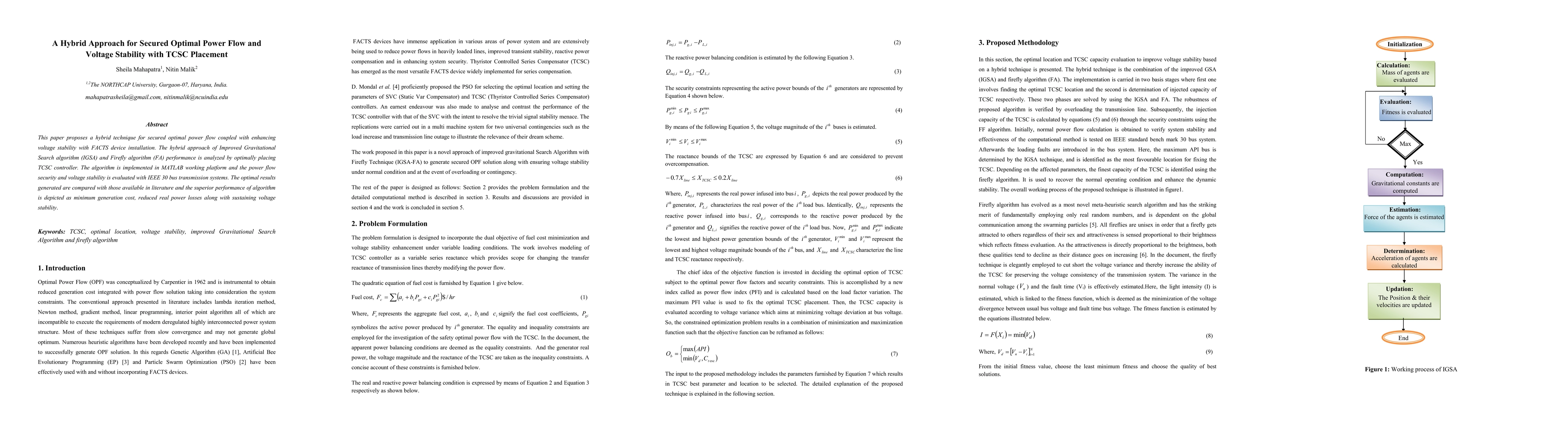 This paper introduces a hybrid technique combining Improved Gravitational Search algorithm (IGSA) and Firefly algorithm (FA) to optimize power flow and enhance voltage stability via TCSC placement. Results from IEEE 30 bus systems show superior performance in terms of lower generation costs, reduced power losses, and sustained voltage stability compared to existing methods.
