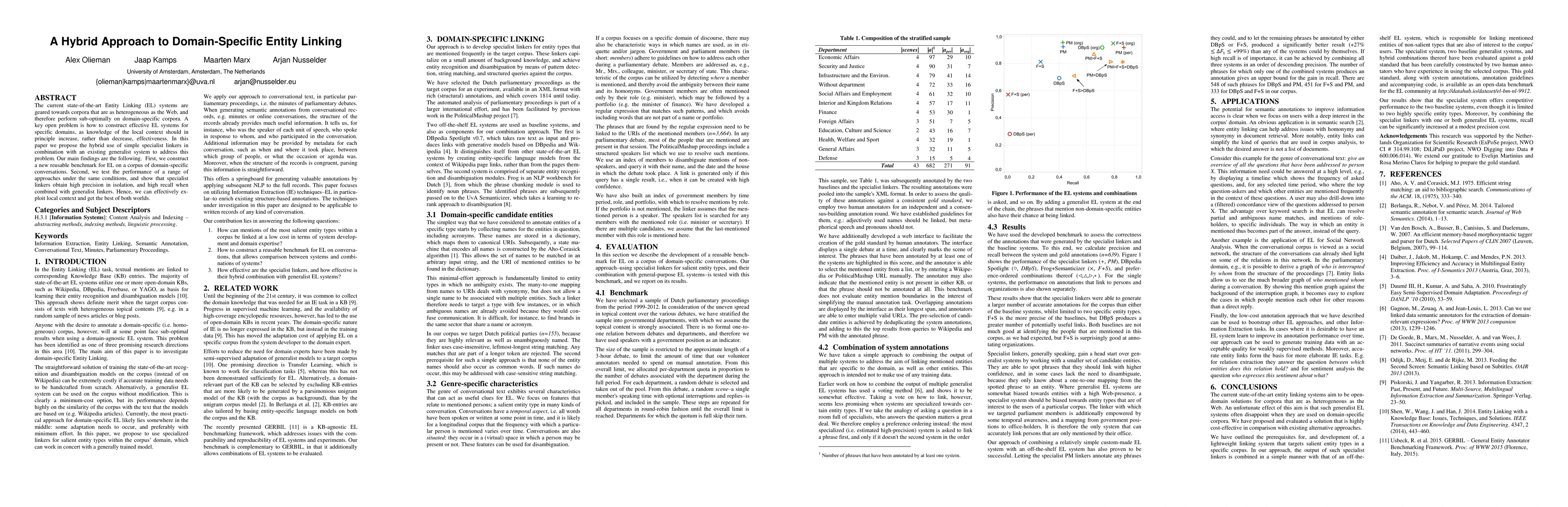 This paper proposes a hybrid approach combining specialist linkers with a generalist system to improve Entity Linking (EL) in domain-specific corpora. The study introduces a new benchmark for domain-specific EL and demonstrates that specialist linkers achieve high precision alone and high recall when integrated with generalist linkers.