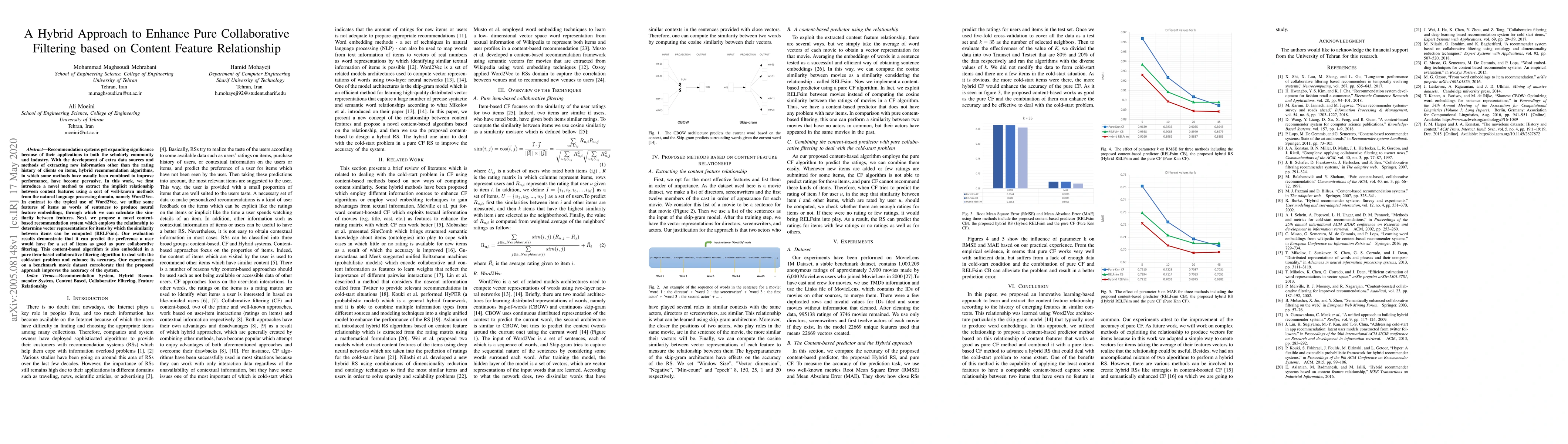 This paper introduces a hybrid recommendation system that enhances pure collaborative filtering by extracting implicit relationships between content features using Word2Vec, creating item similarity representations, and integrating this content-based approach to improve accuracy and address the cold-start problem. Experimental results on a movie dataset show improved performance.