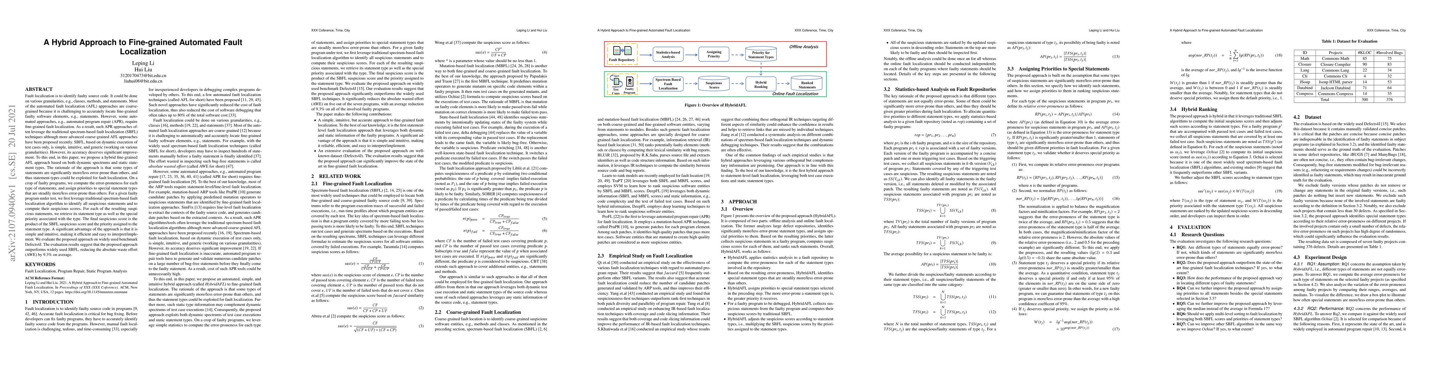 This paper proposes a hybrid fine-grained automated fault localization approach that combines dynamic spectrum-based fault localization with static statement type analysis to improve accuracy. The method assigns priorities to error-prone statement types, enhancing the final suspicious score by multiplying it with the type's priority, leading to better fault localization and a 9.3% reduction in absolute waste effort on Defects4J benchmarks.
