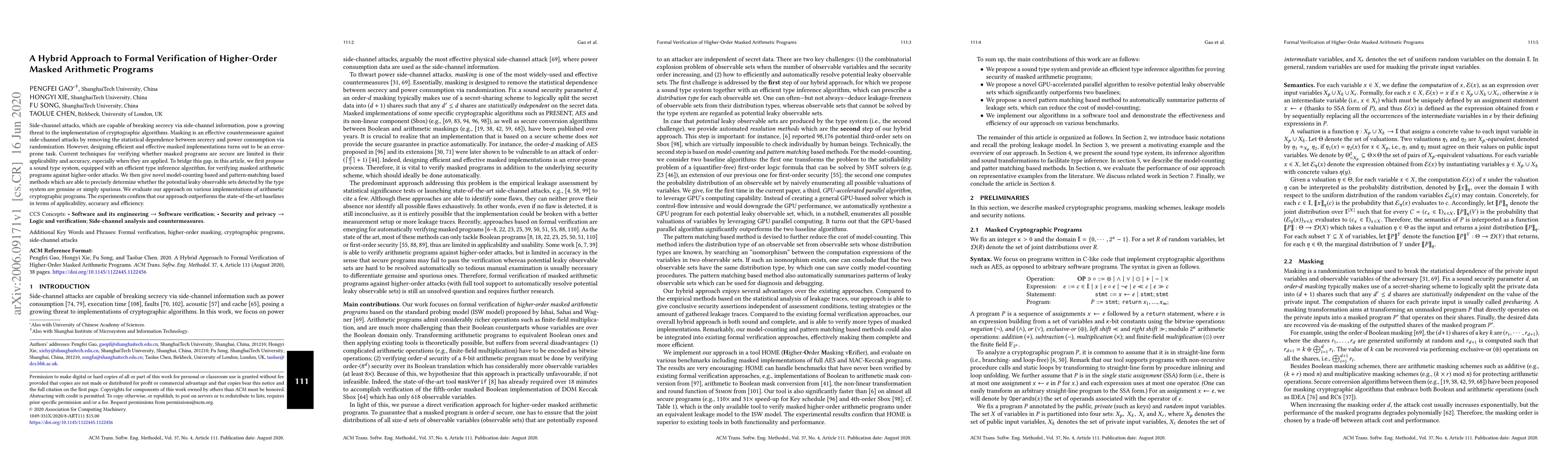 Researchers propose a hybrid approach to verifying masked arithmetic programs against higher-order side-channel attacks, offering improved applicability, accuracy, and efficiency compared to existing methods.