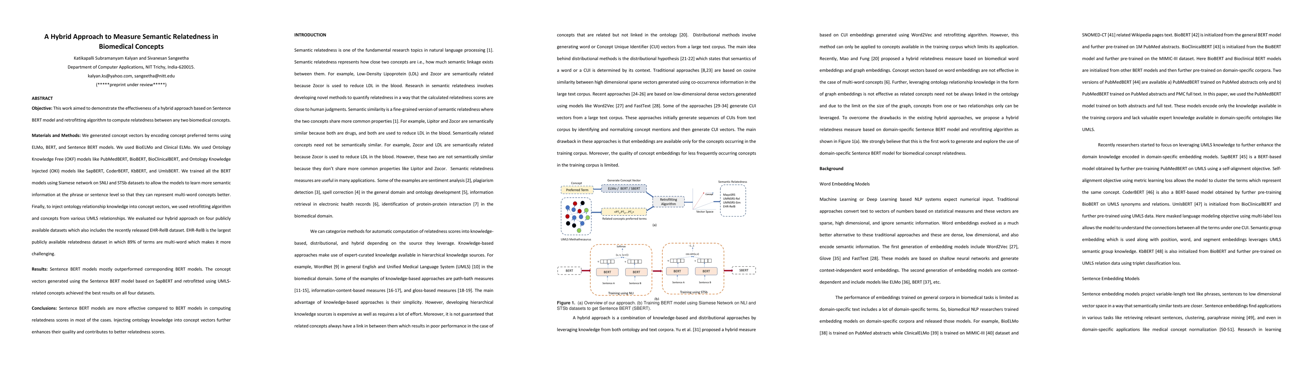 Objective: This work aimed to demonstrate the effectiveness of a hybrid approach based on Sentence BERT model and retrofitting algorithm to compute relatedness between any two biomedical concepts. Materials and Methods: We generated concept vectors by encoding concept preferred terms using ELMo, BERT, and Sentence BERT models. We used BioELMo and Clinical ELMo. We used Ontology Knowledge Free (OKF) models like PubMedBERT, BioBERT, BioClinicalBERT, and Ontology Knowledge Injected (OKI) models like SapBERT, CoderBERT, KbBERT, and UmlsBERT. We trained all the BERT models using Siamese network on SNLI and STSb datasets to allow the models to learn more semantic information at the phrase or sentence level so that they can represent multi-word concepts better. Finally, to inject ontology relationship knowledge into concept vectors, we used retrofitting algorithm and concepts from various UMLS relationships. We evaluated our hybrid approach on four publicly available datasets which also includes the recently released EHR-RelB dataset. EHR-RelB is the largest publicly available relatedness dataset in which 89% of terms are multi-word which makes it more challenging. Results: Sentence BERT models mostly outperformed corresponding BERT models. The concept vectors generated using the Sentence BERT model based on SapBERT and retrofitted using UMLS-related concepts achieved the best results on all four datasets. Conclusions: Sentence BERT models are more effective compared to BERT models in computing relatedness scores in most of the cases. Injecting ontology knowledge into concept vectors further enhances their quality and contributes to better relatedness scores.