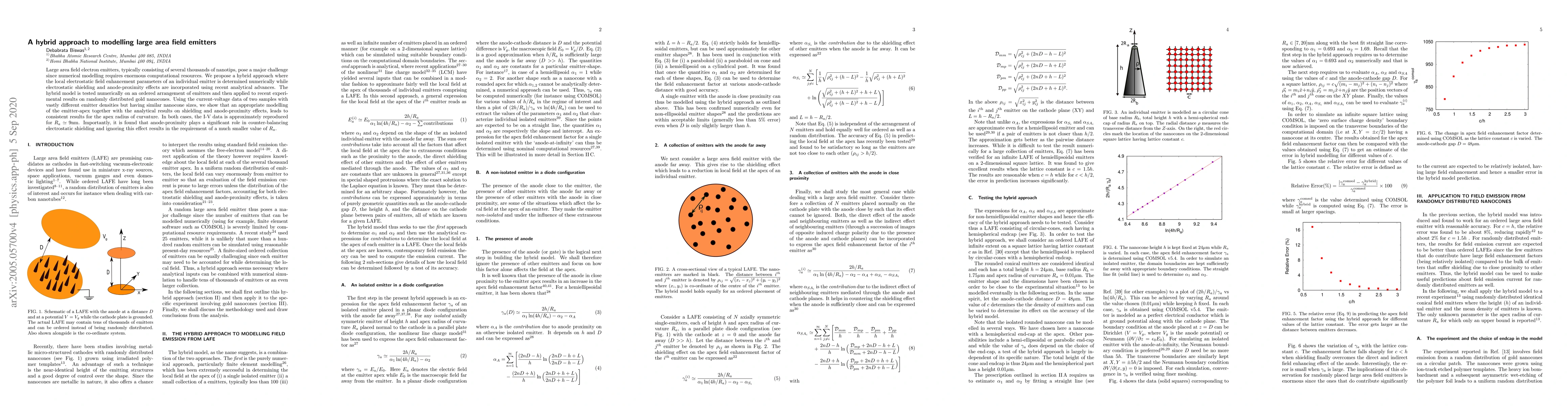 This paper proposes a hybrid modeling approach to efficiently simulate large area field electron emitters, balancing numerical and analytical methods to account for electrostatic shielding and anode-proximity effects. The model accurately reproduces current-voltage data for emitters with similar nanocone sizes, highlighting the importance of anode-proximity in determining the apex radius of curvature.